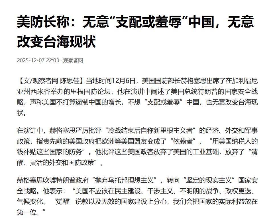 除此之外,赫格塞斯还表示美国将逐渐将重心转移到美国的实际利益上。对于世界格外关注的中美关系,赫格塞斯也提出三个观点。