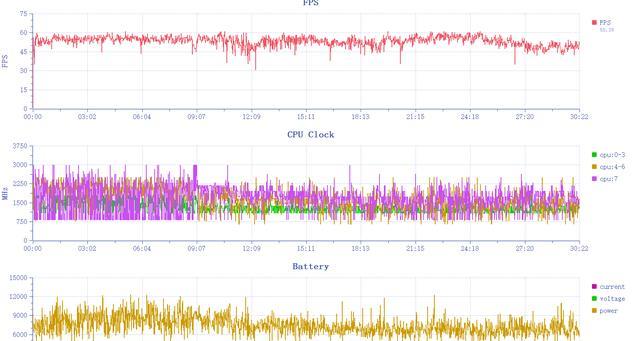 当然,我们依然坚持用游戏表现“说话”。《原神》启动,在须弥城内连续跑图半小时,记录帧率如下,虽然帧率整个过程略有起伏,但整体上还是能够维持高帧率体验,全程没有出现大幅度的掉帧情况,实际体验还是比较流畅的,平均帧率来到了53.16帧。
