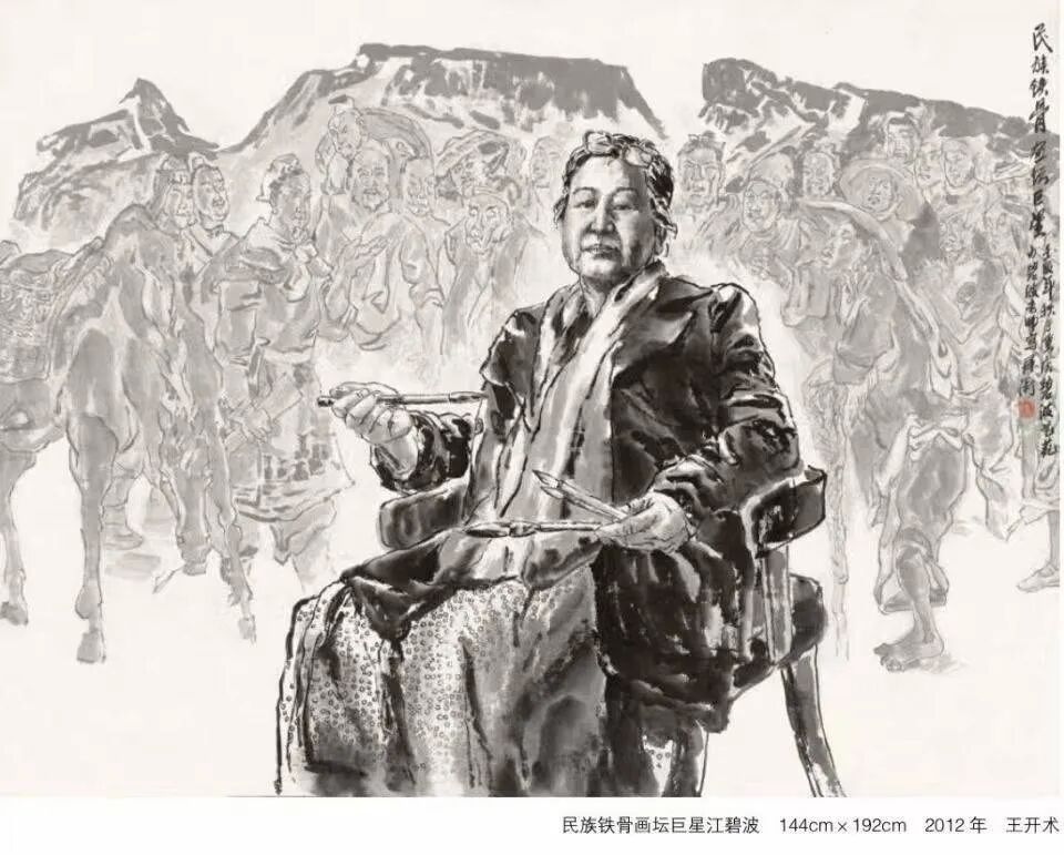 王开术的肖像创作兼具“形”的写实与“神”的提炼。《民族铁骨画坛巨星江碧波》以水墨技法刻画艺术前辈江碧波的形象,主体人物手持画笔、神态从容,背景则以群像与马匹构建出充满张力的场景,既突出了江碧波作为“民族铁骨”的艺术担当,又以群像隐喻其艺术影响力的广度。