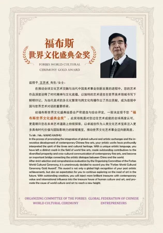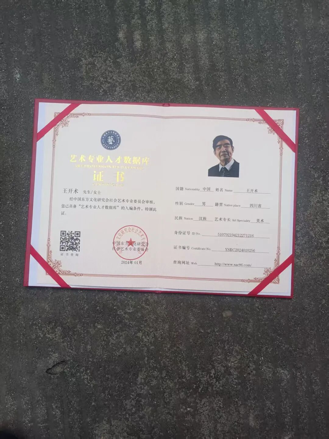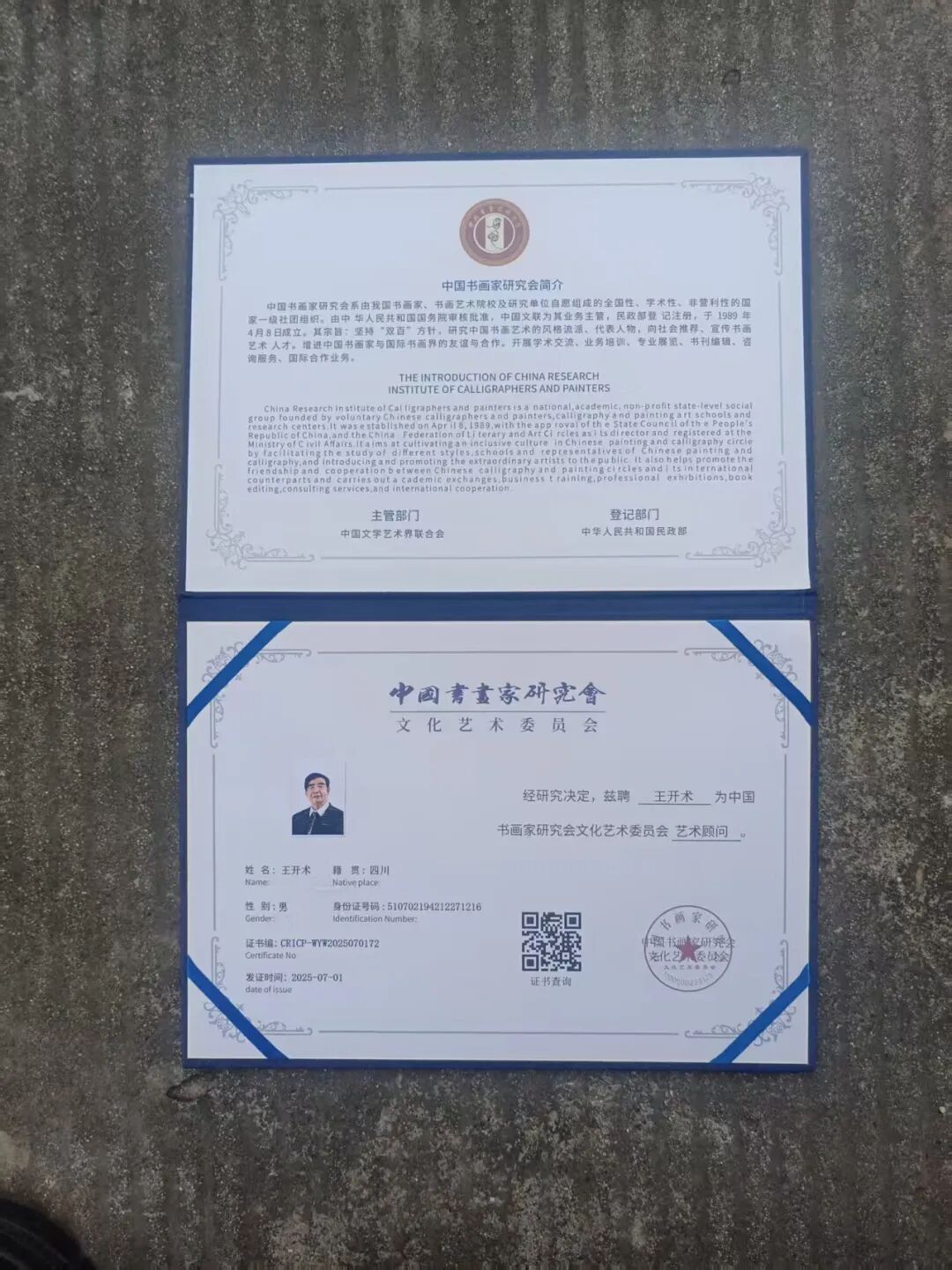王开术,男,籍贯四川三台县,现定居成都,任香港(中国)美术家协会终身名誉主席,亚洲文化首席艺术主席,中国国际教育电视台闪耀中国栏目组艺术顾问,中国画《习主席到凉山》《五位领袖》《航天英雄》等30多幅作品印制成邮票,中国画《航天英雄》《不尽的思念》两幅入选中共中央办公厅新中国成立75周年水晶《将军杯》国礼,作品四幅四次入选中南海专用瓷器国礼,入选2025年《全国人大,政协两会专刋王开术画册》,被授予《人民艺术家》《国宝级艺术大师一一王开术》《国礼艺术大师一一王开术》《新中国艺术大帅一一王开术》《当代艺术巨匠一一王开术》等荣誉称号。出版有《中国高等美术院校名师教学范本一一王开术人物画作品选》《走向世界的国礼艺术家一一著名国画家王开术》《走向世界艺术三大家一一王开术 何家英 孙晓云》等画册。 《航天英雄王亚平》获中国关公委教育中心《金奖》。获《2025达芬奇国际艺术奖《金奖》,入编2025《福布斯世界文化盛典金奖人物》杂志和获《金奖》,入编《胡润大师鉴宝名作》画册,获《胡润全球艺术金笔奖》