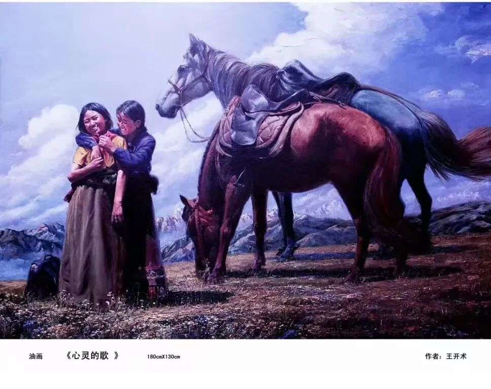 王开术对少数民族题材的关注,既体现了对多元文化的尊重,又饱含人文关怀。油画《藏族女人》以写实技法展现藏族同胞的服饰细节与精神面貌:厚重的色彩、细腻的笔触将藏族服饰的质感、配饰的精美一一呈现,背景的砖石结构则烘托出地域文化的独特性。《心灵之歌》更是将这种关怀推向诗意境界:高原风光下,两位少女依偎互动,马匹悠然伫立,画面色彩偏冷却充满温情,写实技法让场景极具代入感,而人物的纯真笑容与自然的辽阔悠远,则共同谱写了一曲关于人性、自然与民族文化的“心灵之歌”,展现出少数民族生活中质朴而动人的精神世界。