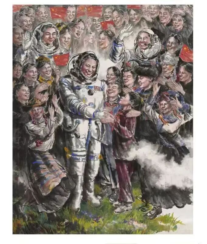 他的历史题材作品并非简单的“事件记录”,而是通过艺术提炼,将历史精神转化为可感知的视觉符号。这些作品成为集体记忆的“艺术载体”,让后人在欣赏笔墨与色彩的同时,重温民族抗争与团结的历史,实现了历史记忆在艺术维度的传承与活化。从航天英雄到当代学者,王开术的创作始终与时代同频。让艺术成为时代精神的“视觉凝练”,既记录了时代的发展轨迹,又为社会注入了积极向上的精神力量。