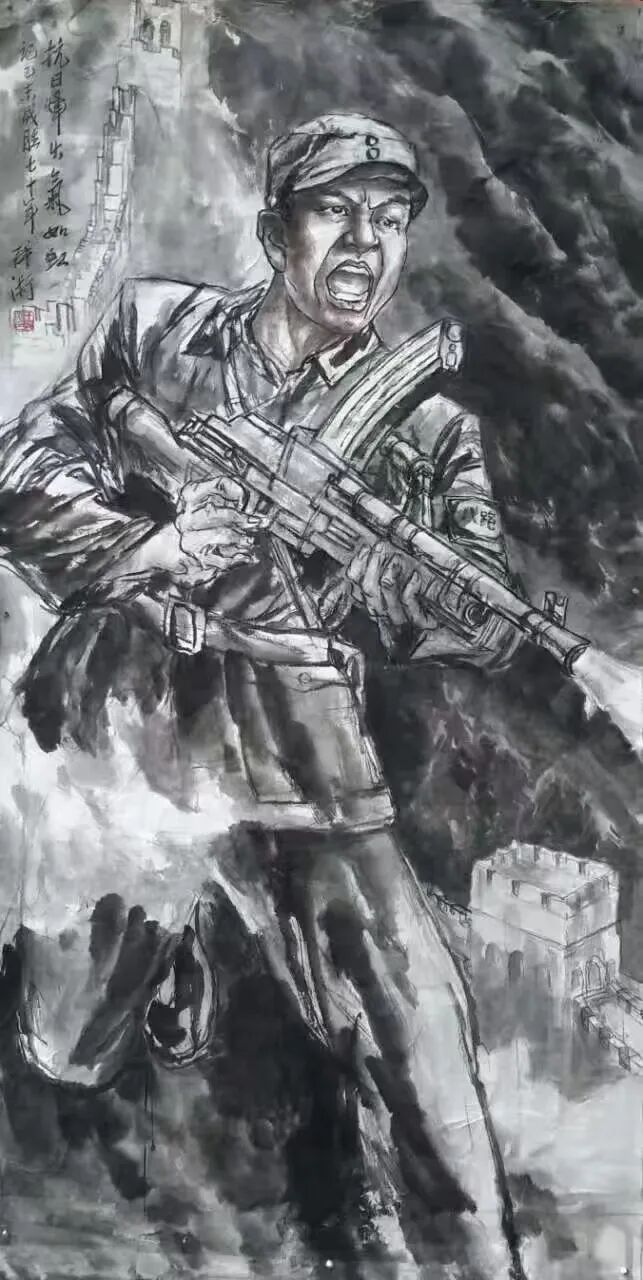 在水墨作品《抗日烽火气如虹》中,他以苍劲的笔墨塑造了抗日军人的激昂形象:人物神情坚毅、呐喊冲锋,手中枪械与身上“八路”臂章明确身份,背景长城的巍峨轮廓则锚定了民族精神的象征。笔墨的浓淡枯润间,既有传统水墨的写意张力,又有写实主义的细节刻画,将抗日将士的铁血丹心与民族气节渲染得淋漓尽致,成为爱国主义题材创作中兼具艺术性与感染力的典范。