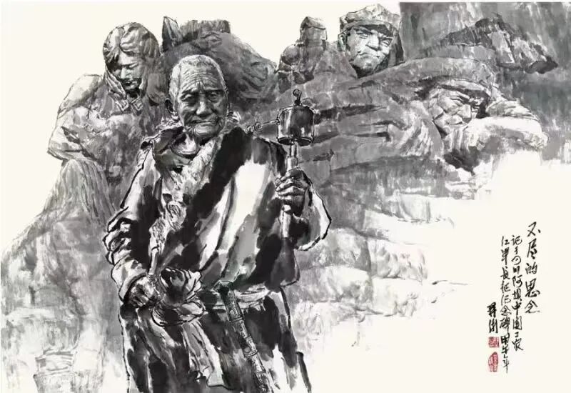 《不尽的思念》则聚焦革命历史与民族情感的交融:藏族老人手持转经筒,面容沧桑却眼神坚毅,背景若隐若现的红军群像,将红军与藏族同胞的鱼水情定格为永恒的历史记忆。这种题材选择,既体现了对革命先烈的缅怀,又彰显了民族团结的历史纵深,让红色记忆在水墨晕染中获得了跨越时空的生命力。