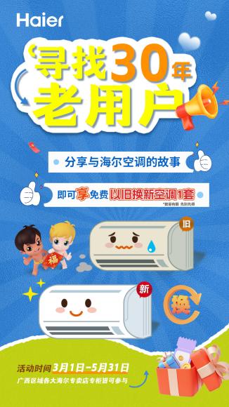 家里有30年海尔空调的用户朋友们看这里!活动期间可以到店享受免费以旧换新空调一套,数量有限,先到先得哦!