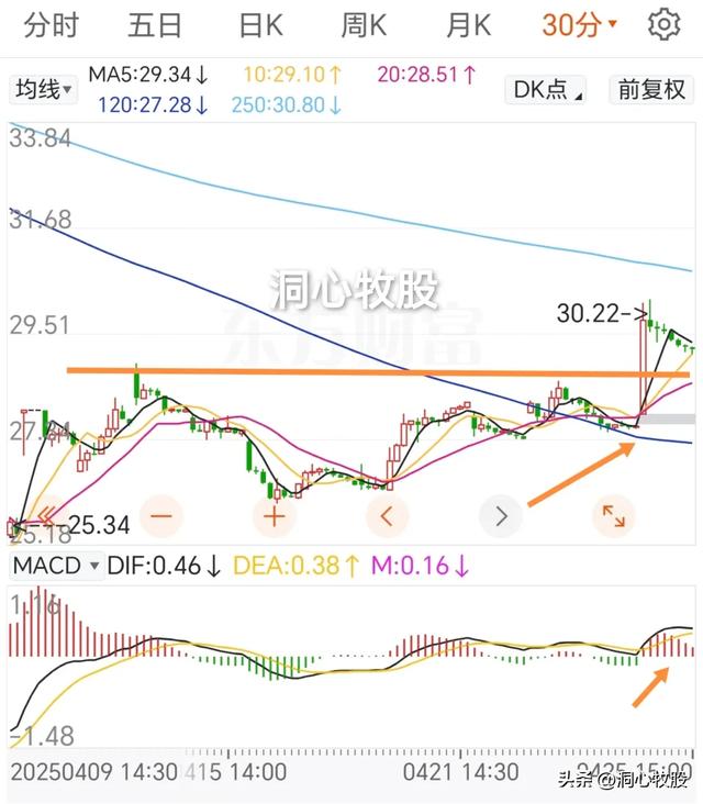30分钟图中,k线突破前高,突破120均线,向上概率较大,MACD金叉。