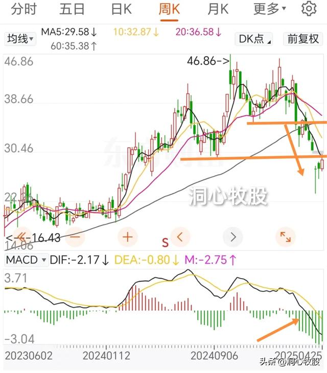 周k线图中,k线超跌反弹,下跌一次穿过前低、此前低,MACD趋势向下。