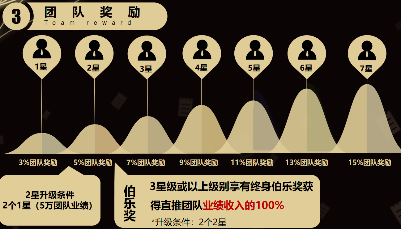 团队奖励才是终极杀招!设置 1-7 星晋升体系,分润比例从 3% 一路飙升至 15%:1 星享 3% 团队奖励,2 星 5%(需 2 个 1 星 + 5 万团队业绩),3 星 7%(需 2 个 2 星),4-7 星分别解锁 9%-15% 团队奖励(进阶考核即可)。更狠的是 “终身伯乐奖”——3 星及以上级别,直推团队业绩 100% 全额归你!晋升像打怪升级,目标清晰可见,收入随团队规模呈指数级暴涨!