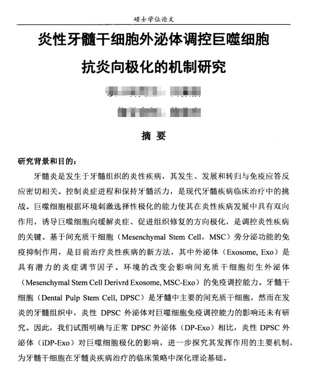 相关文献:炎性牙髓干细胞外泌体调控巨噬细胞抗炎向极化的机制研究