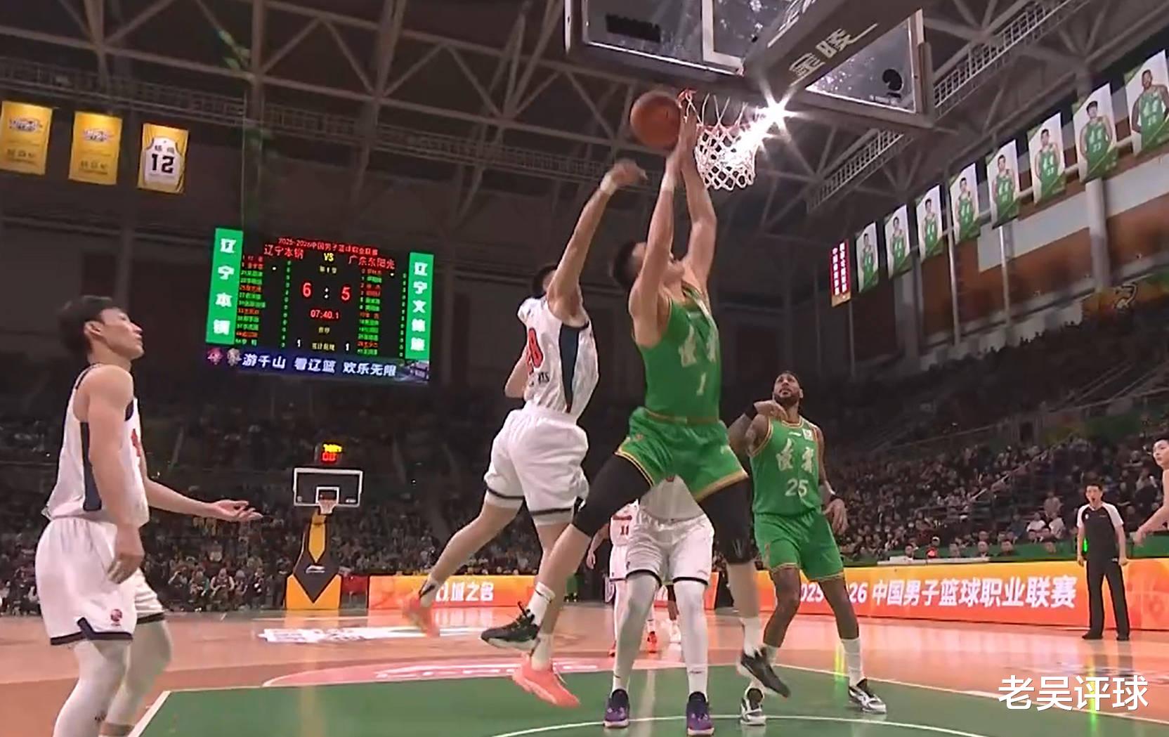 在辽粤男篮大战上,王洪泽投中职业生涯第一个三分球,还是顶着付豪自信出手,分差大就敢出手投没压力了。王洪泽加陈家政真是未来可期,这两小孩敢打敢拼,真的可以期待下。分差在不断的拉大,比赛有个镜头,赵继伟坐在场边双手捂着头,这样的表情也是很无奈。半场比赛结束,辽宁本钢主场39-64广东东阳光,辽宁队暂时落后25分。