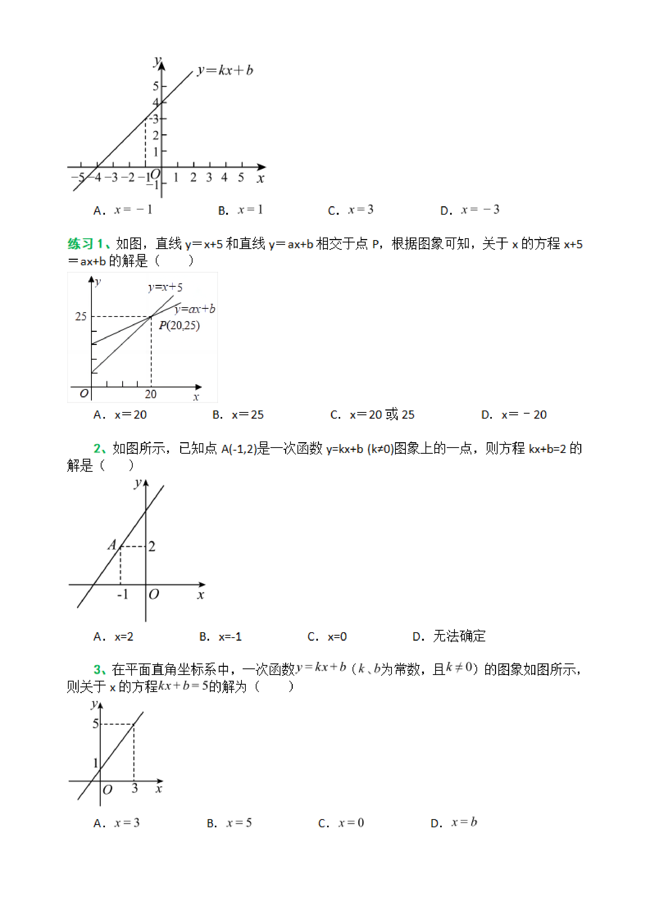 练习1、如图,直线y=x+5和直线y=ax+b相交于点P,根据图象可知,关于x的方程x+5=ax+b的解是( )