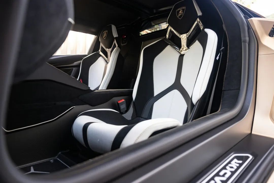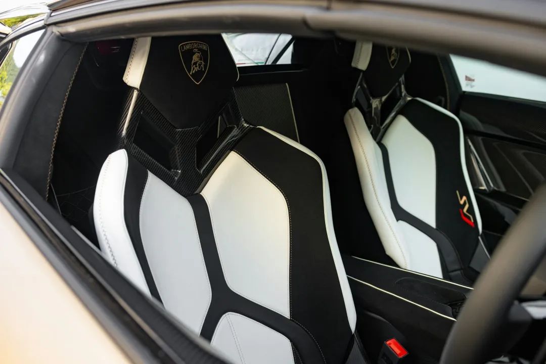 内饰方面,采用对比鲜明的黑白双色皮革和黑色Alcantara材质,配以白色缝线,座椅头枕上绣有兰博基尼标志,座椅侧面绣有SVJ标志。