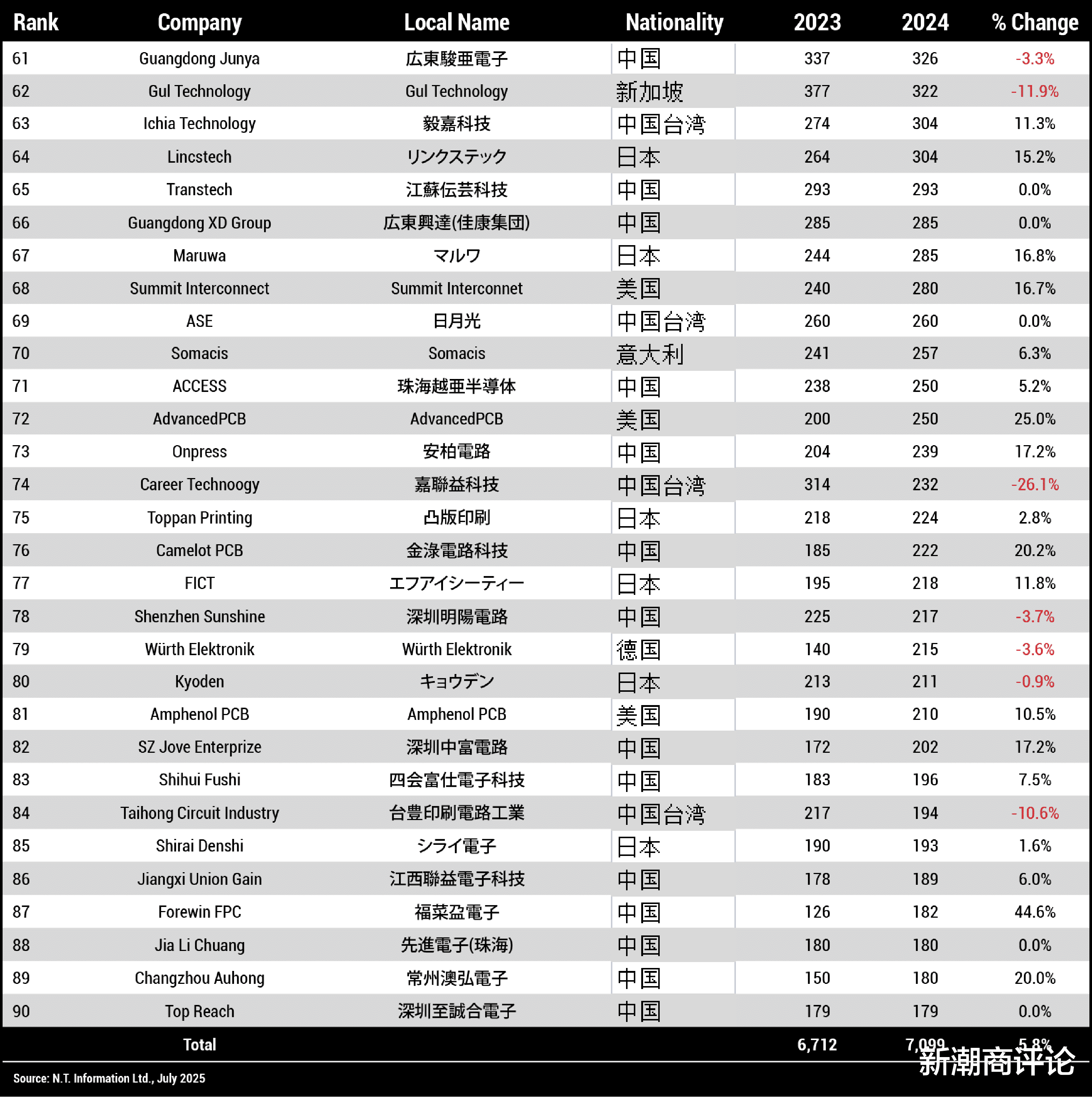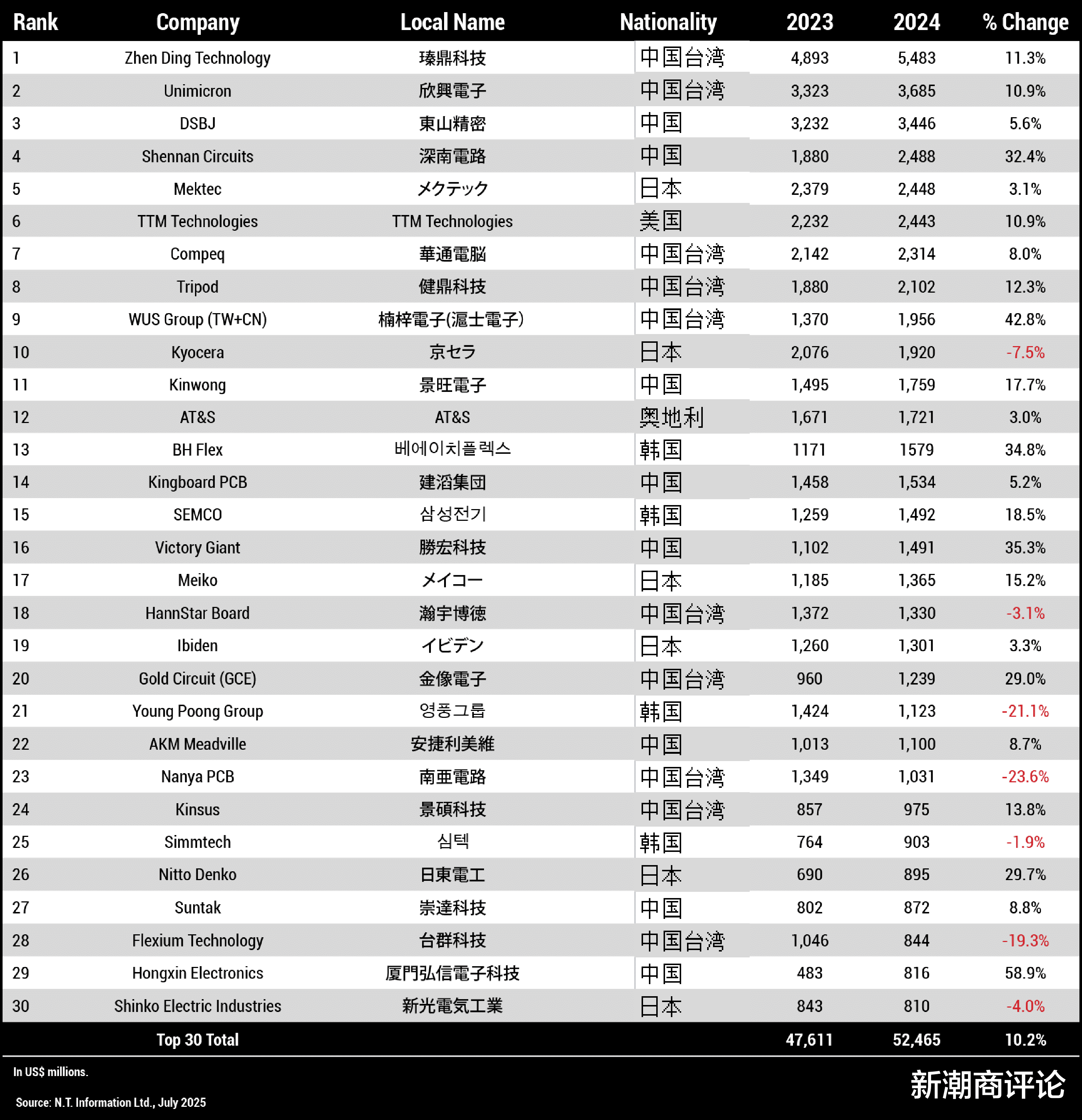 美国的TTM Technologies (迅达科技)和奥地利的AT&S(奥特斯),是前三十名中唯二的非亚洲企业。前者总部位于美国加利福尼亚州,在全球拥有22家工厂、1.7万名员工及1800余名工程师。