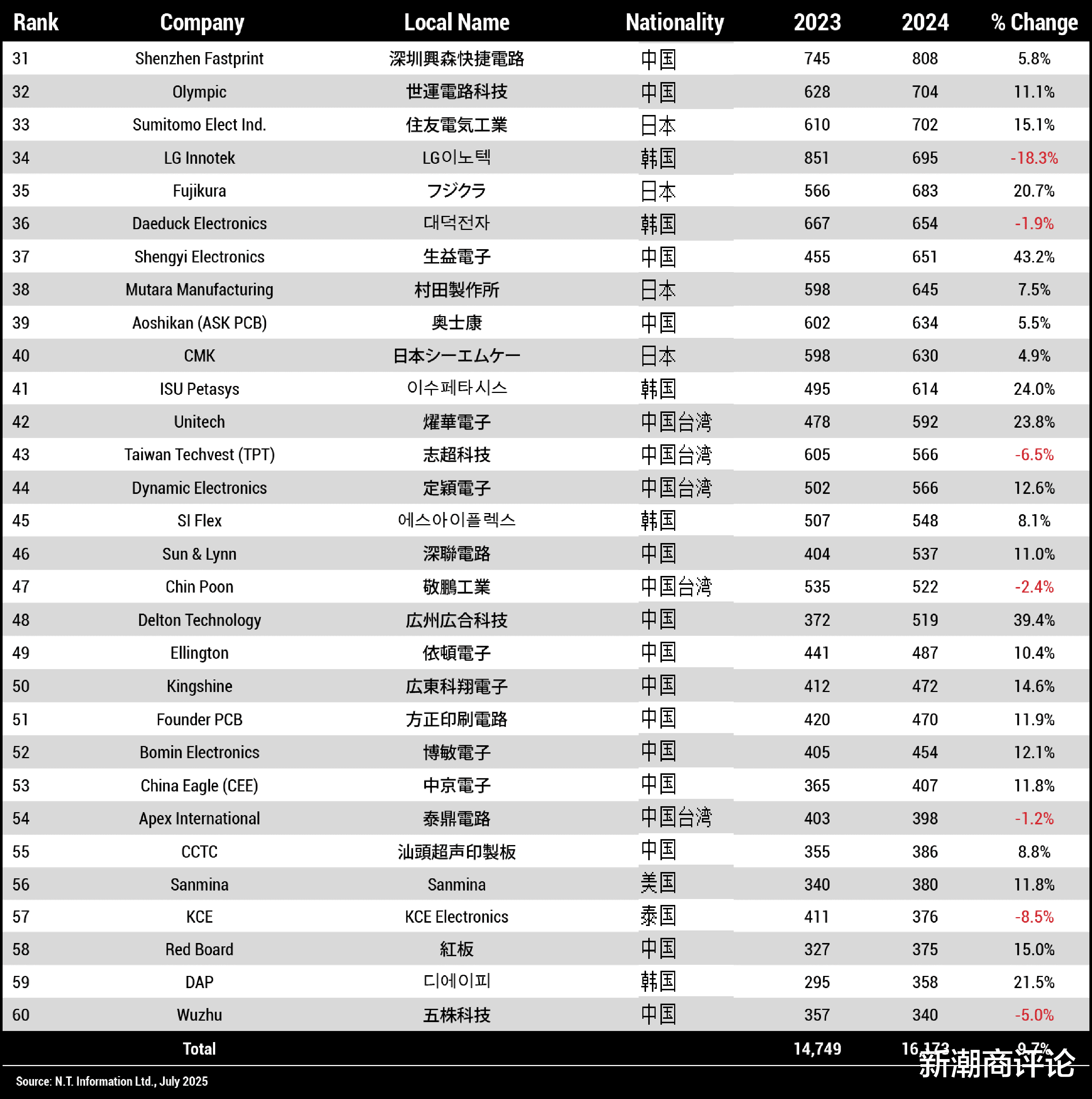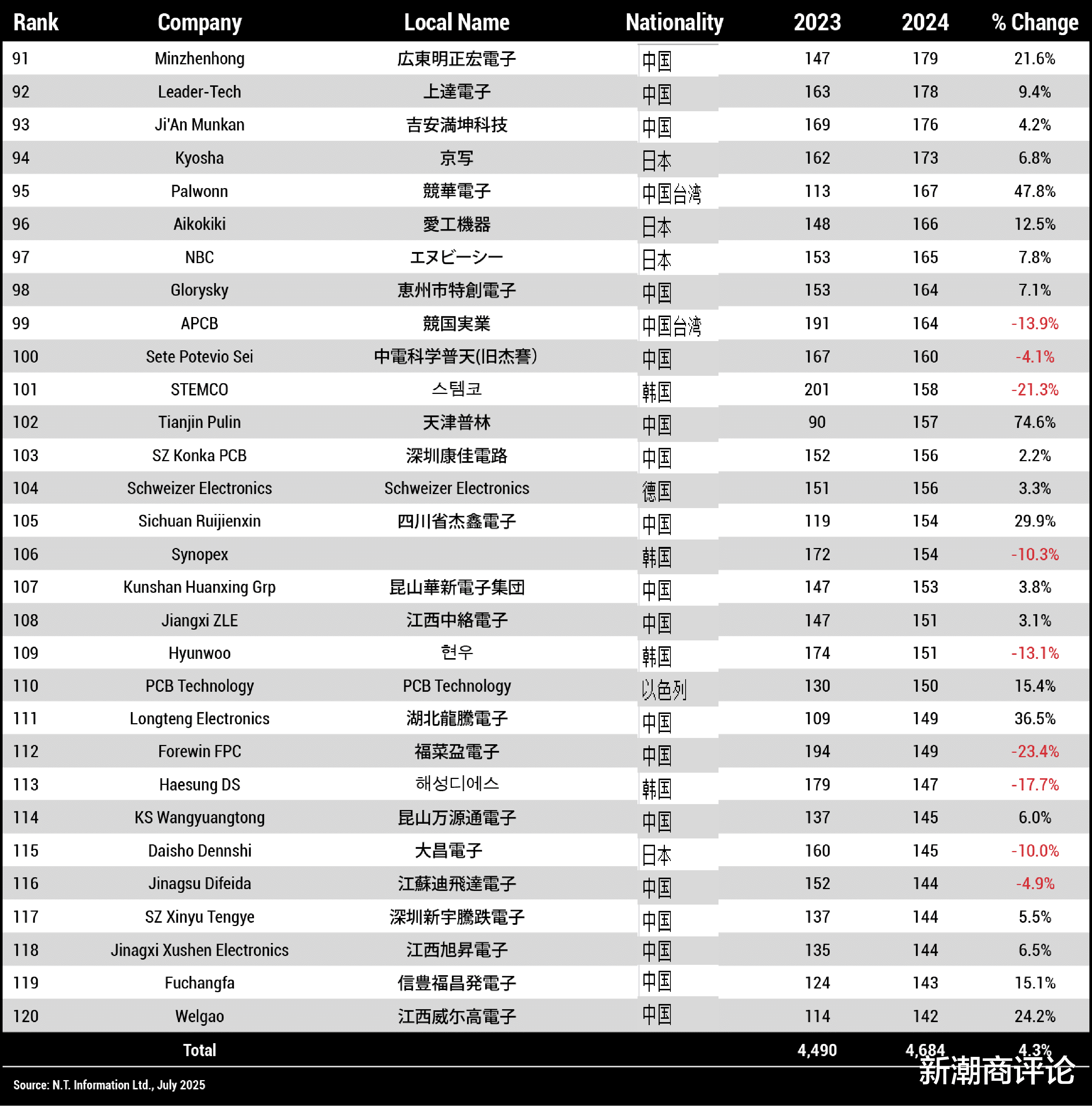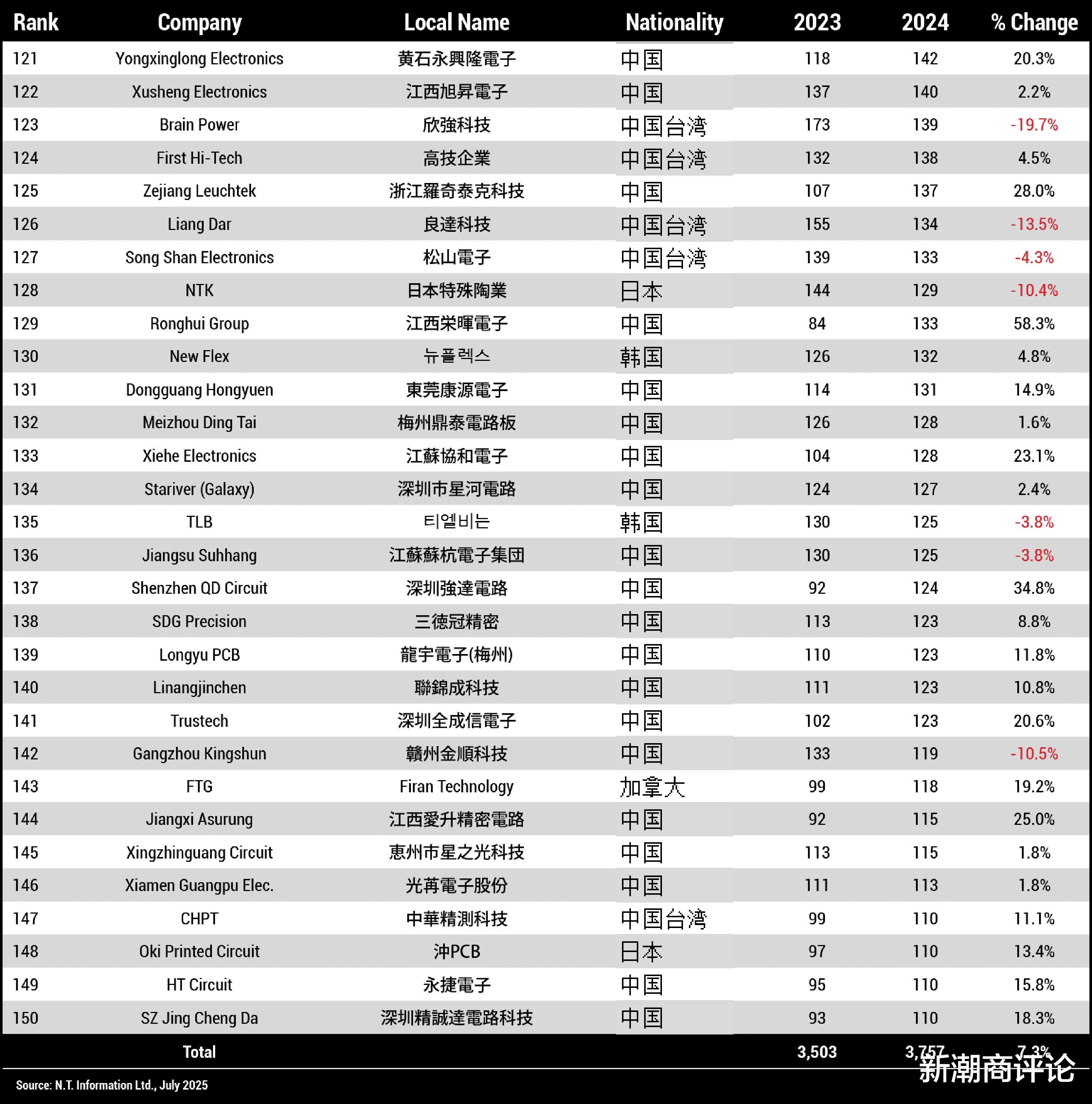 从地区分布来看,作为全球最大的PCB生产国,中国共有109家企业上榜,占比接近七成。其中,大陆地区83家,总营收300.77亿美元,同比增长24.3%,占比35.3%;台湾地区26家,总营收255.88亿美元,同比增长7.8%,占比30.0%。