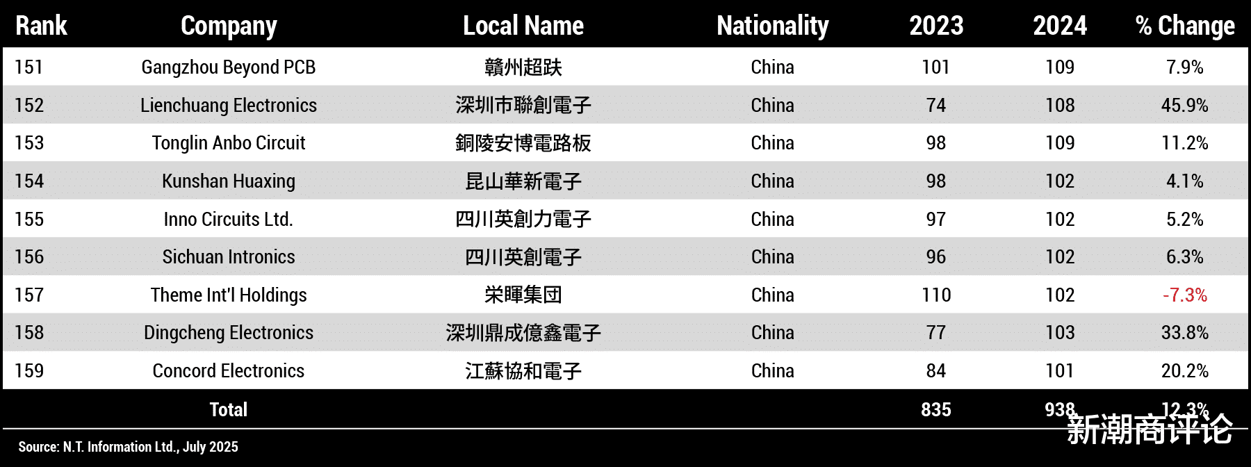 下面根据知名调研机构N.T.Information发布的2024年全球PCB百强榜单,简单了解一下行业格局。共有159家PCB企业2024年营收超过1亿美元,总营收达851.43亿美元(约合人民币6029亿元),同比增长9.3%。