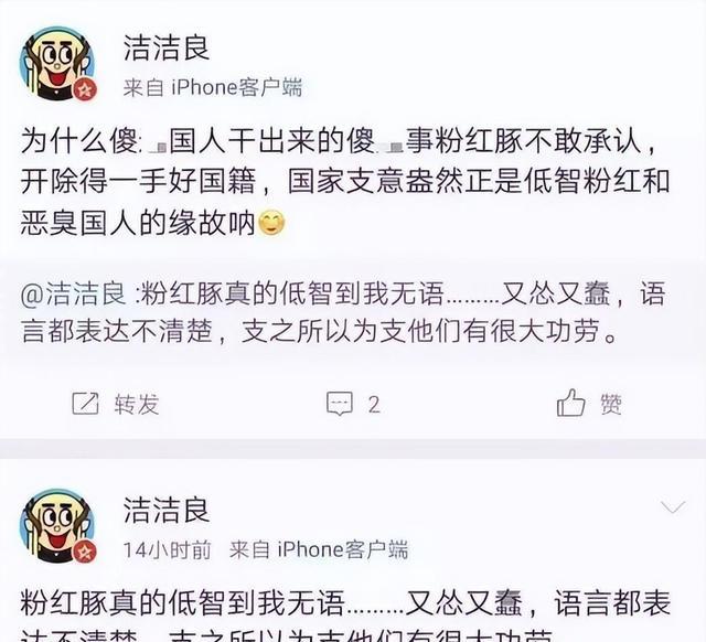 在社交平台大量使用“粉红豚”“国家支意”“低智粉红”“恶臭国人”这些具有侮辱性质的词汇。