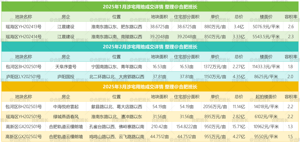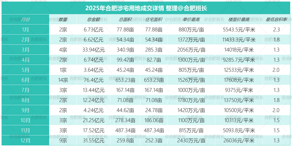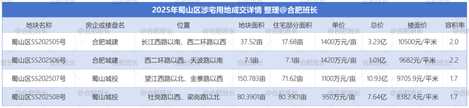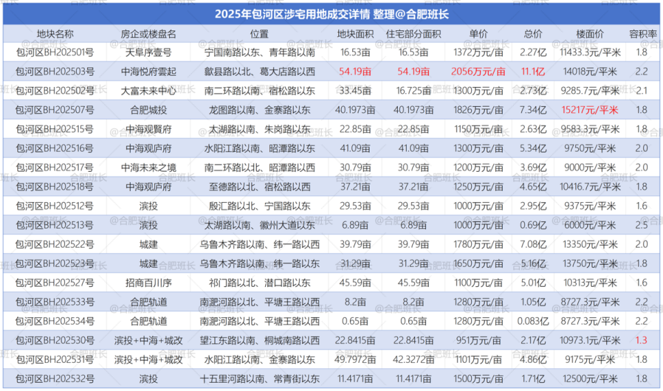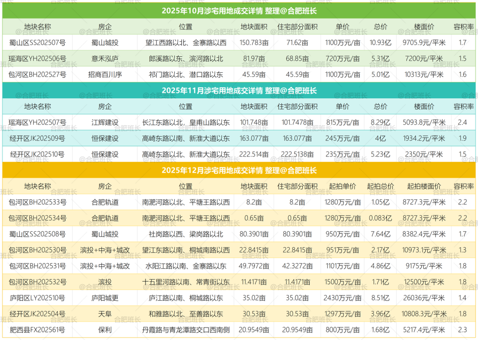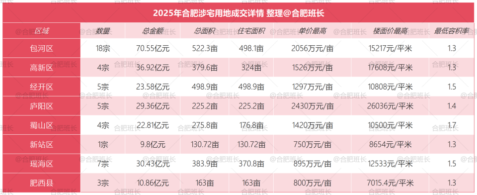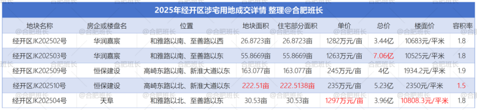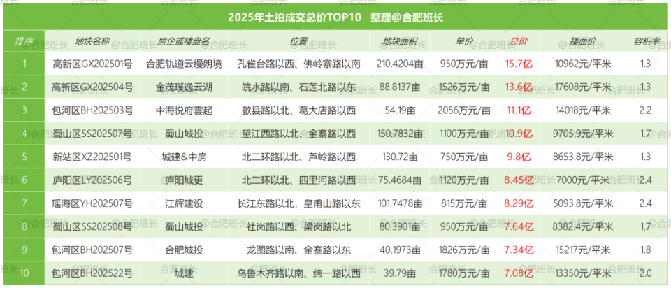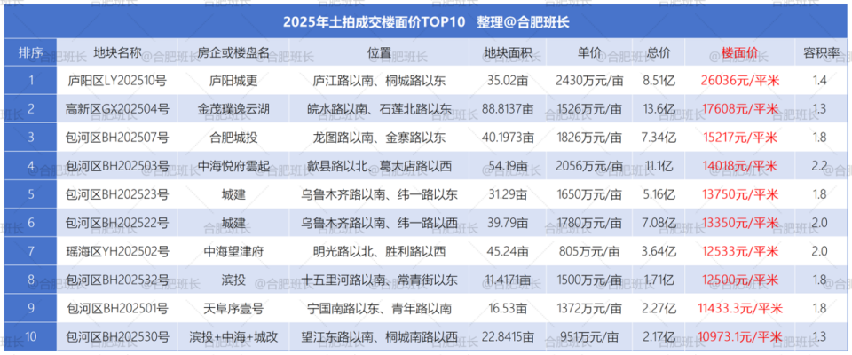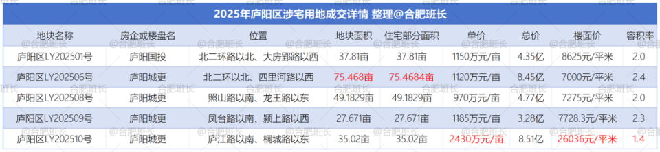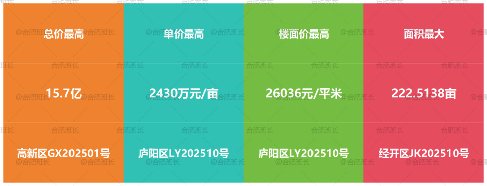 单价最高的为庐阳区LY202510号,单价达到2430万元/亩,同时也是楼面价之最,楼面价26036元/平米;总价最高是高新区GX202501号,总价15.7亿;经开区JK202510号地块面积最大,达到222.5亩。