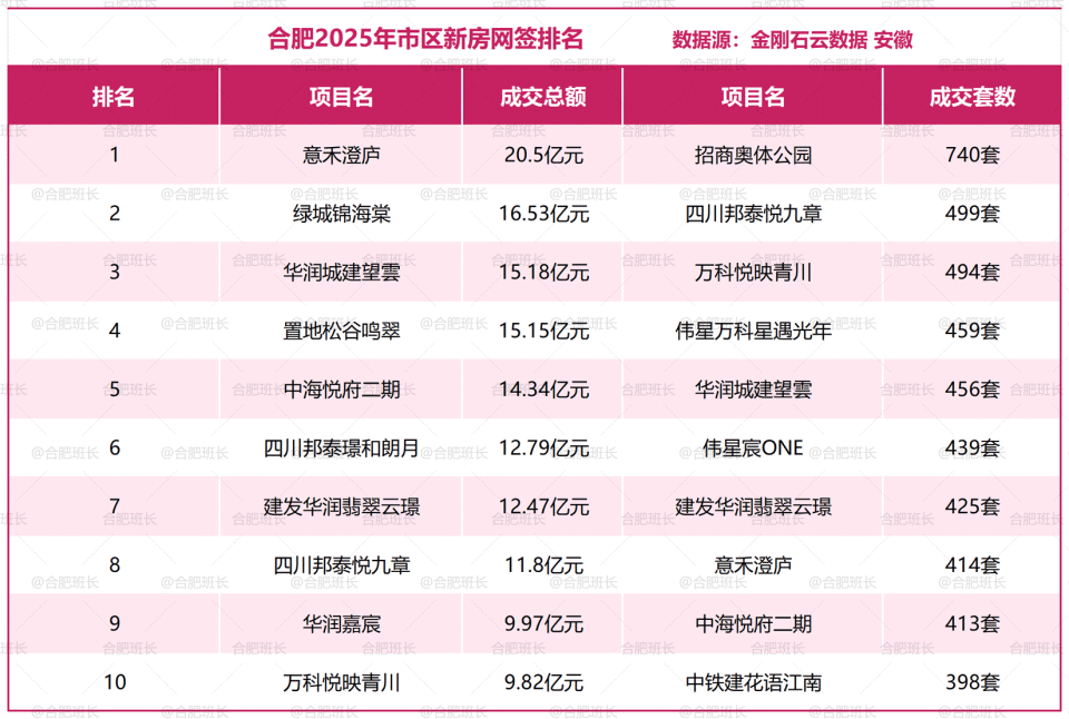 而成交套数榜上,排名第一的则是新站超级大盘招商奥体公园;瑶海东新的四川邦泰悦九章以499套排名第二,第三名则是庐阳大杨镇板块的万科悦映青川。之后是伟星万科星遇光年、华润城建望雲、伟星宸ONE、建发华润翡翠云璟等项目。
