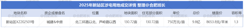 在单价方面,2025年有两宗地块单价突破2000万/亩,分别是庐阳城更今天拿下的双本部和中海悦府雲起。