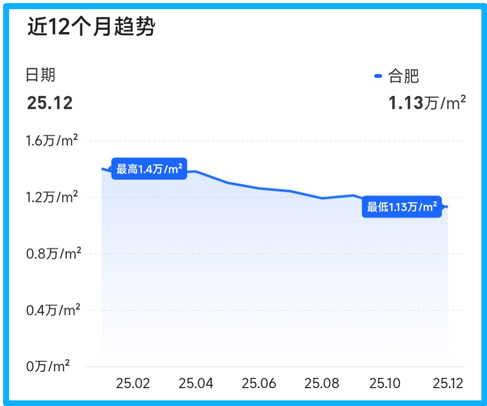 根据贝系指数(住宅数据班长15日以后整理发布)显示,2025年合肥二手房均价呈下滑趋势,全年1月份均价最高,为1.4万/平;12月最低,为1.13万/平,不过10、11、12月已经趋于平稳,波动很小。