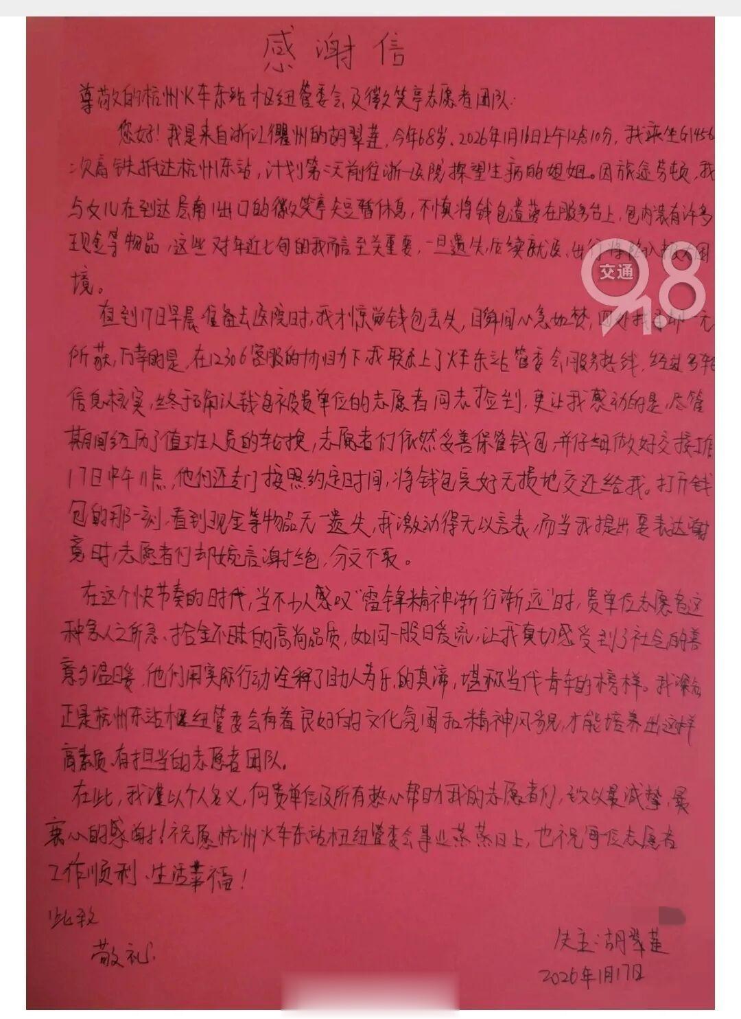 写信的是68岁的衢州旅客胡阿姨。1月16日中午,她和女儿坐高铁来到杭州东站,准备第二天去医院看望生病的姐姐。旅途劳顿,她们在到达层南1出口的“微笑亭”旁坐下休息,顺手把钱包放在了服务台边。