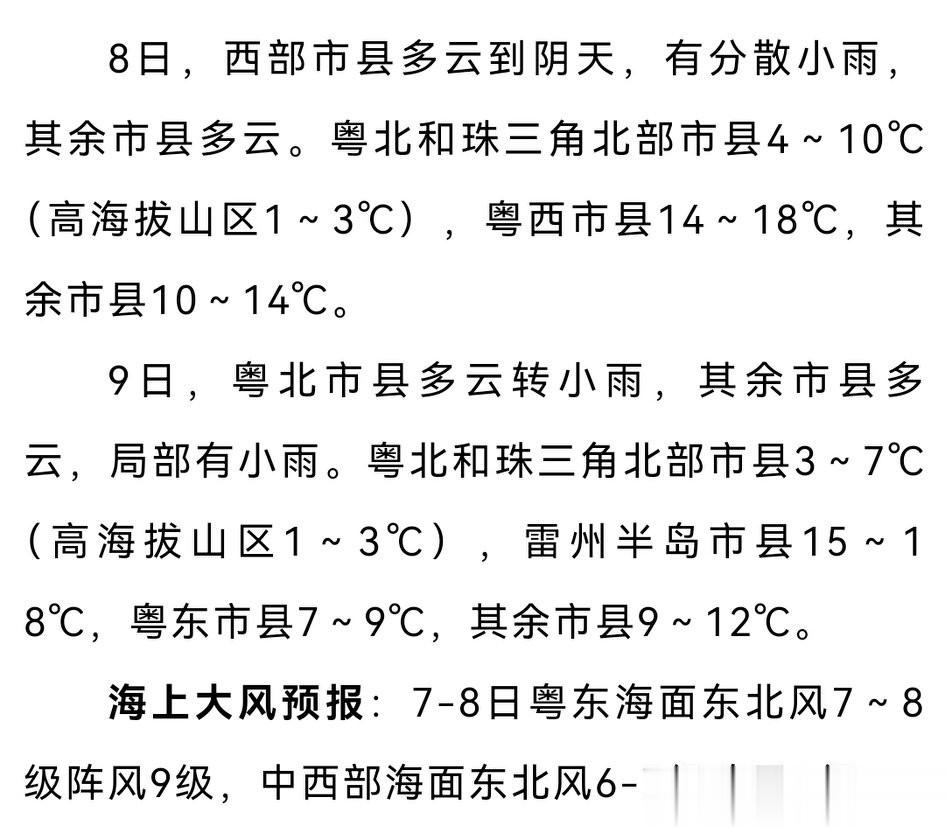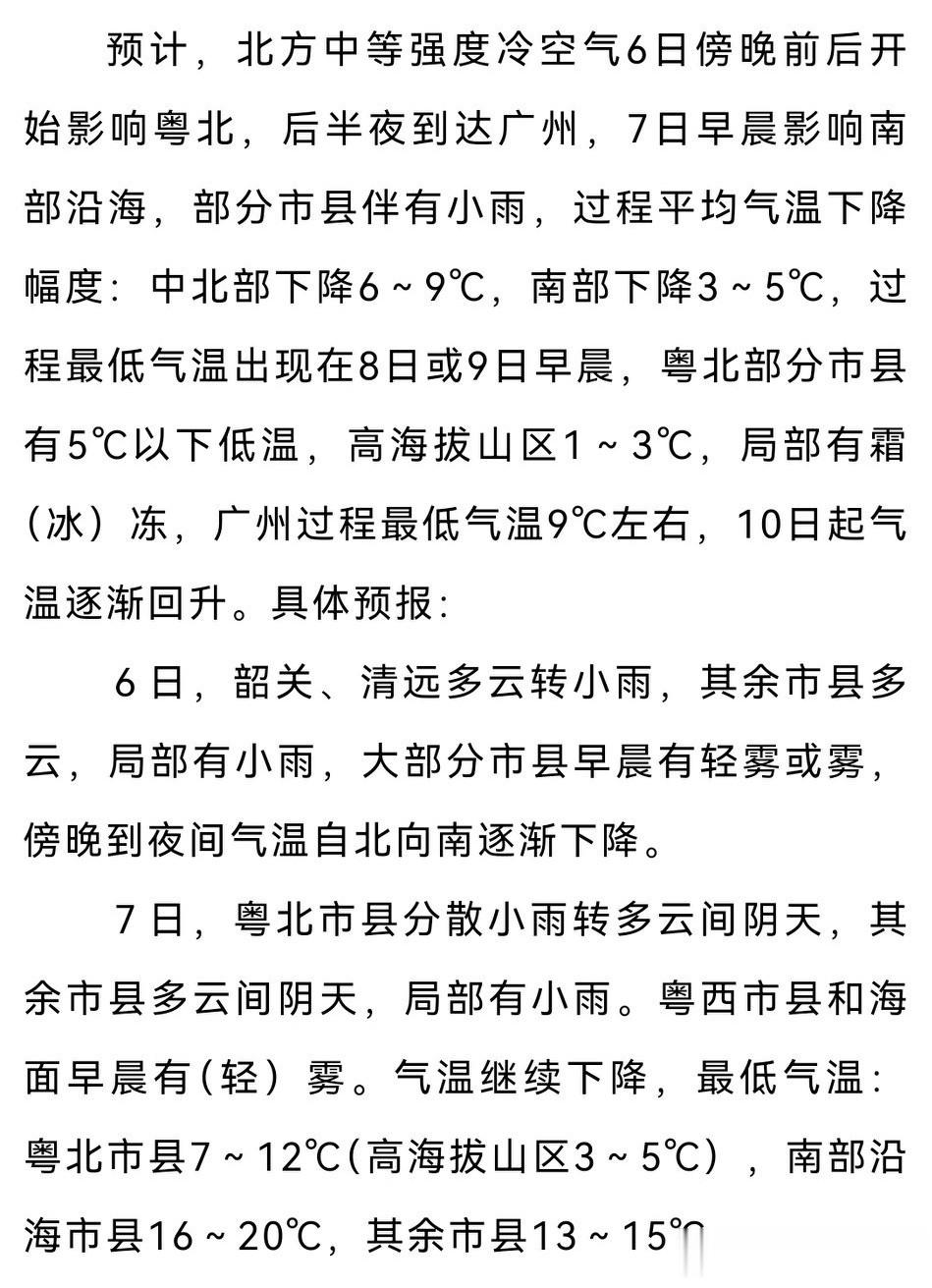 粤中北部下降6~9℃