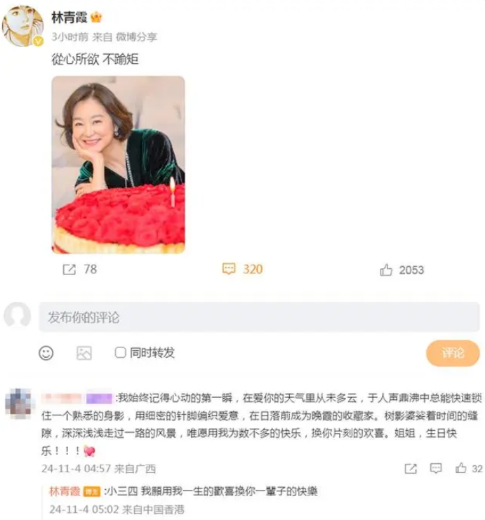 令人意外的是,向来低调的林青霞破例作出回应:"我愿用我一生的欢喜换你一辈子的快乐。"这句温暖的话语,瞬间引爆社交平台,获得数万点赞,众多网友纷纷转发评论:"这就是我们心目中的女神!"