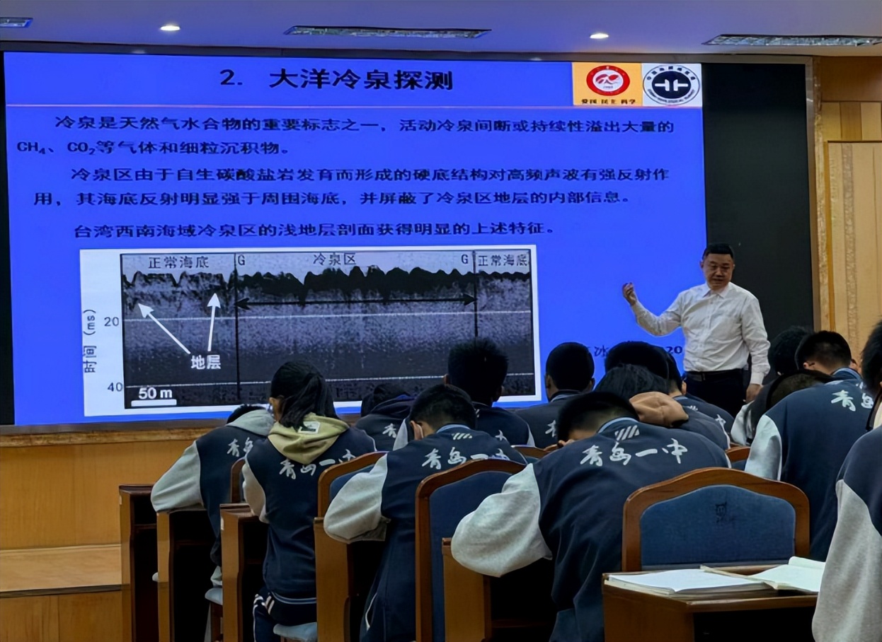 聘任仪式后,顾兆峰以《透视海底的眼睛——浅地层剖面》为题开展科普讲座,围绕海洋声学探测原理、设备技术、实际应用及发展趋势等专业内容,用通俗语言为高一年级100余名同学解锁海底奥秘,带领大家领略海洋科学的奇幻魅力。