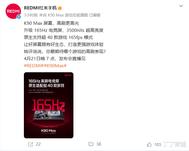 4 月 21 日见 开启手游性能新时代REDMI K90 Max 并非常规迭代,而是针对硬核手游玩家的专项升级,以 “高刷高亮屏、双芯强性能、主动强散热” 构建三重游戏壁垒,重新定义 K 系列性能上限。