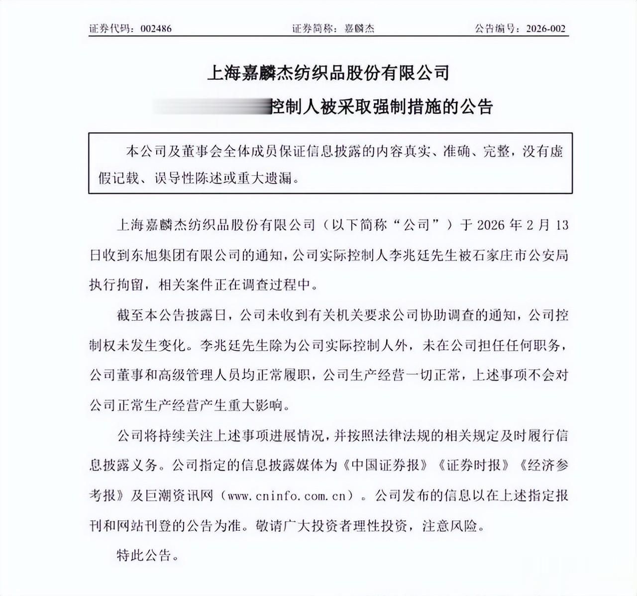 嘉麟杰作为剩余平台,继续运营,但“东旭系”已崩塌。2026年2月13日,李兆廷被石家庄市公安局拘留,进入刑事阶段。