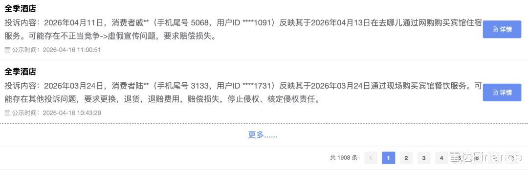 此外,截至发稿,在全国12315消费投诉信息公示平台上搜索“全季酒店”关键词,可以获取到超1900条结果。