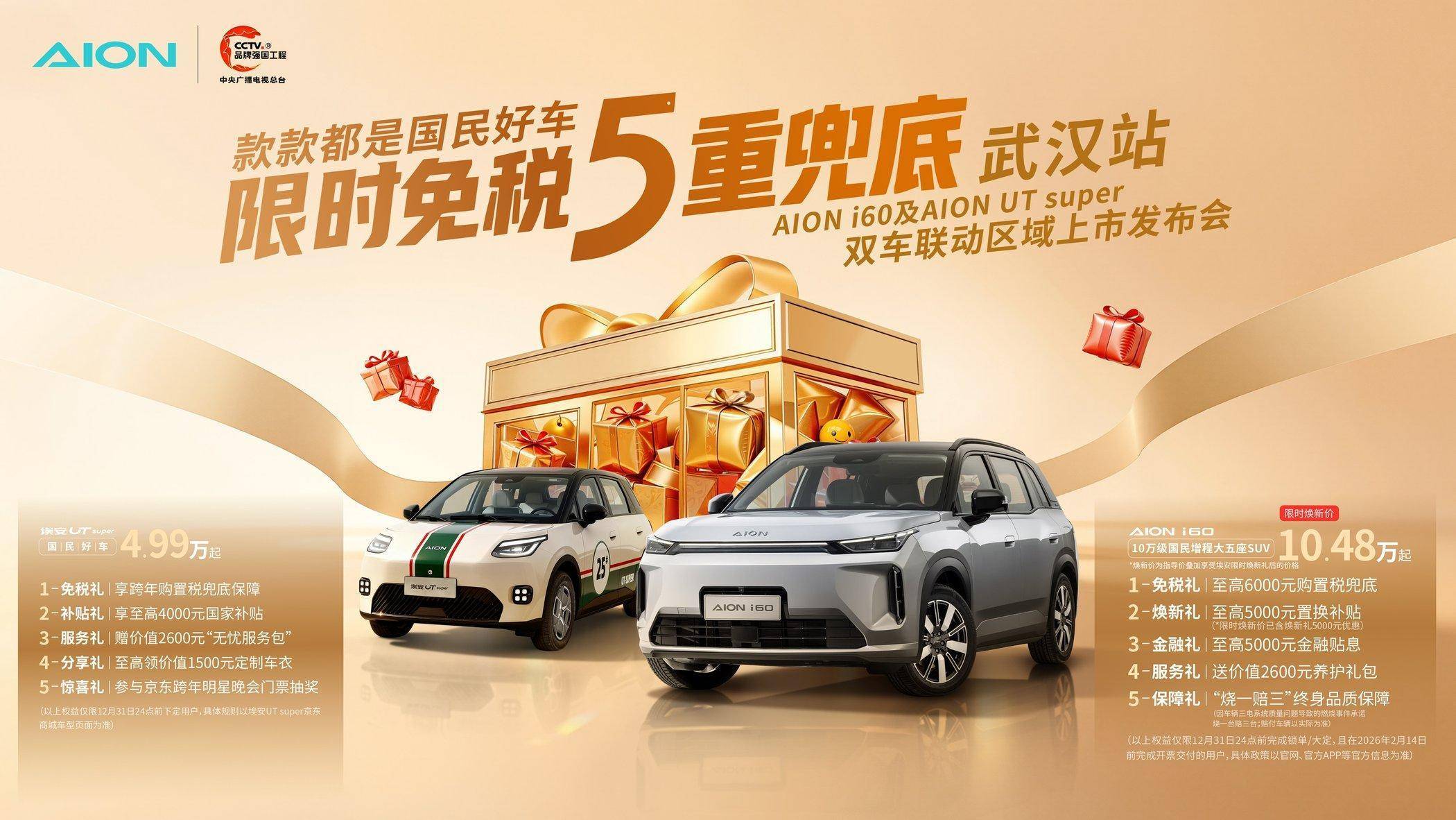 【武汉,2025年12月20日】晚18时,广汽埃安"AION i60 & UT Super双车区域上市发布会"在武汉龙湖滨江天街1F中庭璀璨启幕。本次发布会以"款款都是国民好车 限时免税5重兜底"为主题,为江城消费者带来了一场集科技、时尚与实惠于一体的汽车盛宴。