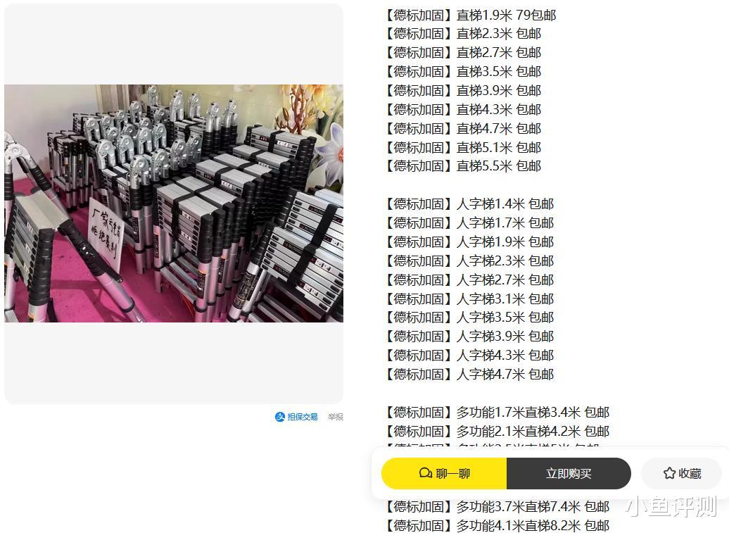 卖家描述很简单:“厂家仓库升级,福利价清一批好质量梯子”。关键词是“德标加固”和“全新”。价格从79元(估计是最小号的人字梯或直梯)覆盖到5米多高的型号。这价格是什么概念?你去楼下五金店,同样宣称加厚的梯子,一米多高的人字梯可能就要价近百元。这波工厂清仓,确实是不讲武德,直接打响了针对线下渠道的价格战。