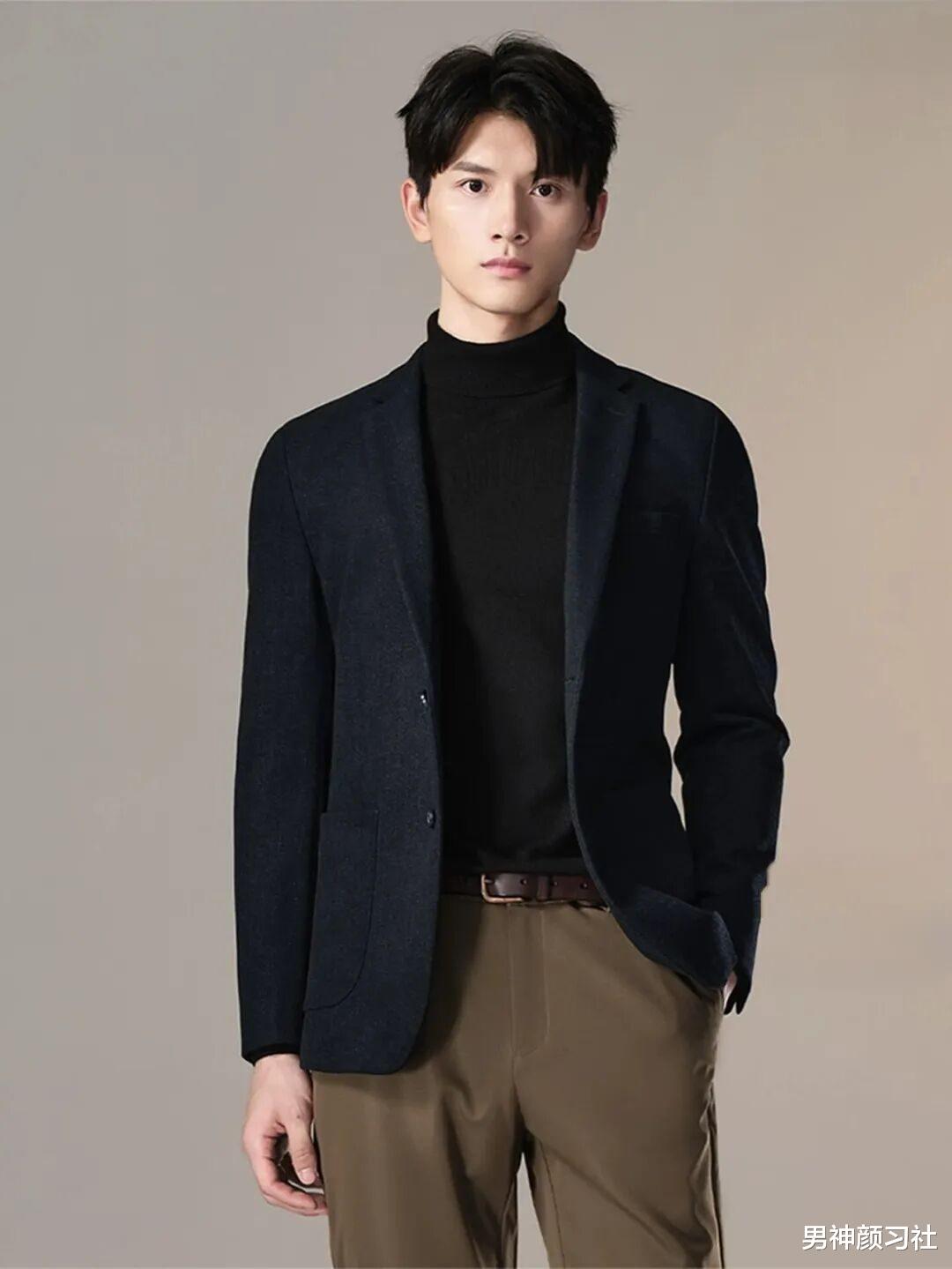 在春天那些还不算太暖和的地方,西装的穿搭需要一点保暖智慧。在深色系西装,比如深蓝或深咖里,穿一件同色系的高领衫,下半身搭配一条卡其色裤子这种穿搭不仅保暖,更展现出一种很有层次的质感。