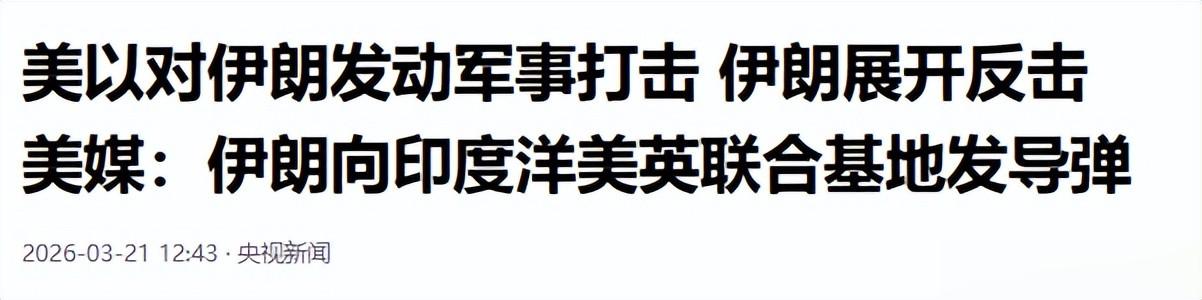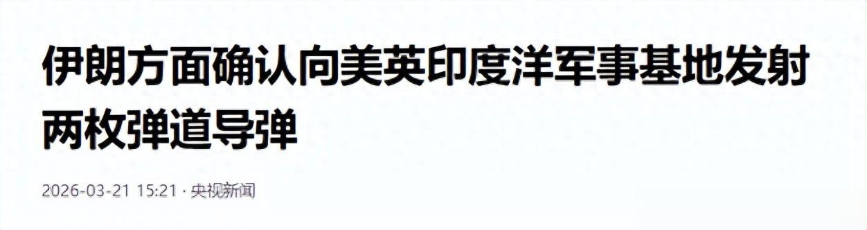 “4000公里!伊朗下一步随时可以炸欧洲了!”央视新闻在2026年3月21日报道称,伊朗确认向位于印度洋中部的美英联合军事基地迪戈加西亚岛发射两枚弹道导弹。据悉,该射程距离逾4000公里。伊朗方面表示,此举显示伊朗导弹射程超出“敌方”此前预期,彰显了伊朗对美国及其盟友的威慑能力。