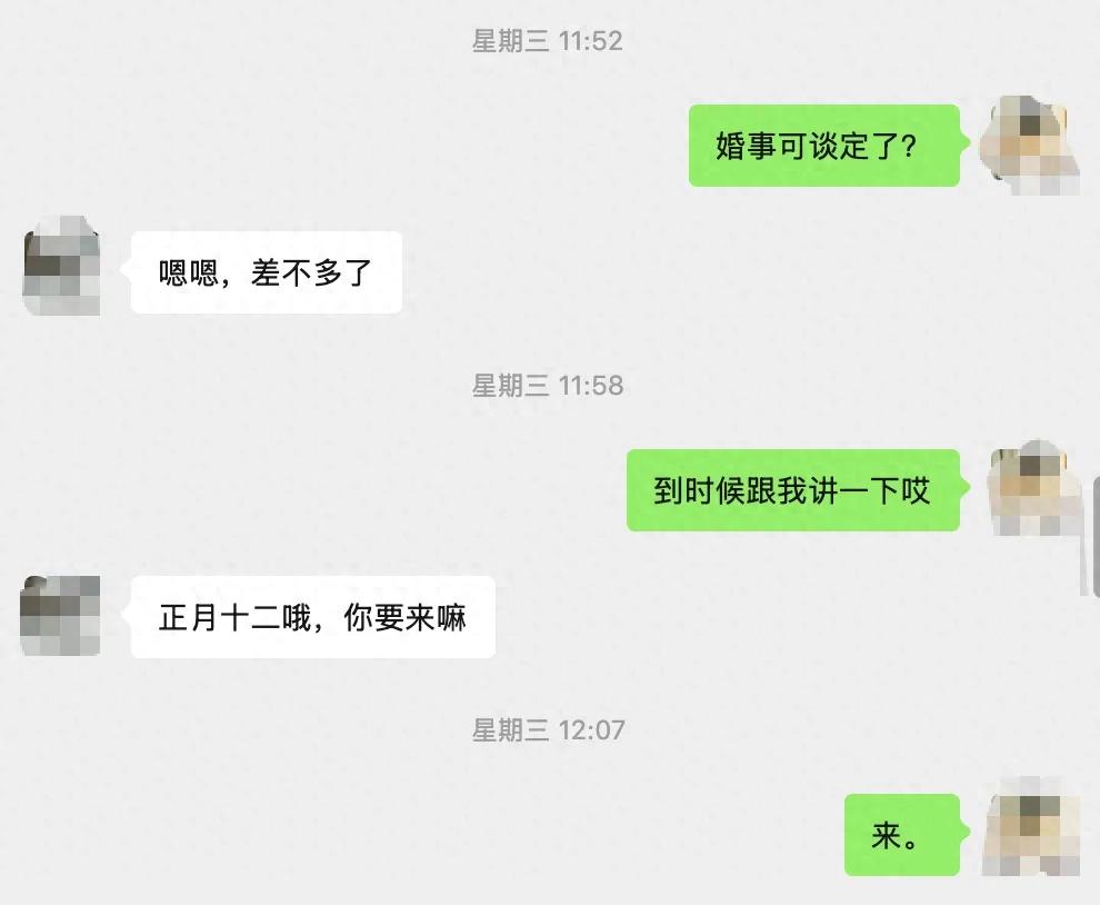 上个礼拜在群里看群成员名片,正好看到家门口的发小,他在镇上居住没回村。所以我主动聊了聊,主要还是关心他的婚姻状况。不过好在这一次,终于听到他说,婚事定了,并且在正月十二就举行婚礼了。