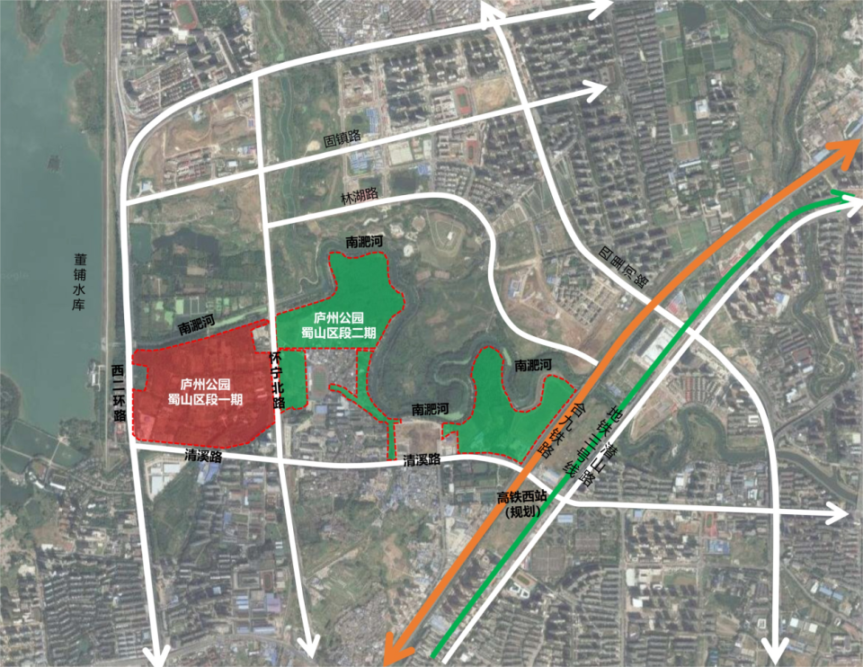 庐州公园(蜀山区段)又再分成一、二期建设,一期项目位于西二环以东、清溪路以北、怀宁北路以西、南淝河以南,紧邻董铺水库,建设规模39.9公顷。