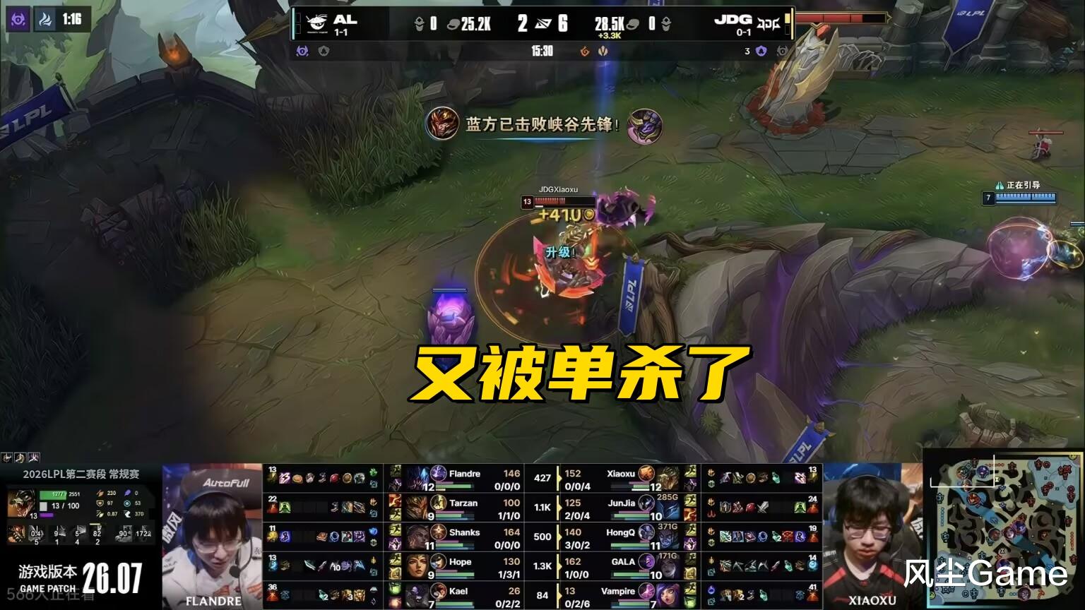 京东下路卡莎,对线能力是不强的,但Hope还是压不住,甚至补刀还落后,上路圣枪哥,也是日常养爹,玩挖掘机打鳄鱼都没混住,中期被小徐鳄鱼单杀,只要一劣势,这阵容中期就没得玩了,对面随便往里冲,AL都是接不住的,最终比赛29分钟结束,先选的轮子妈,被打成了1-7。