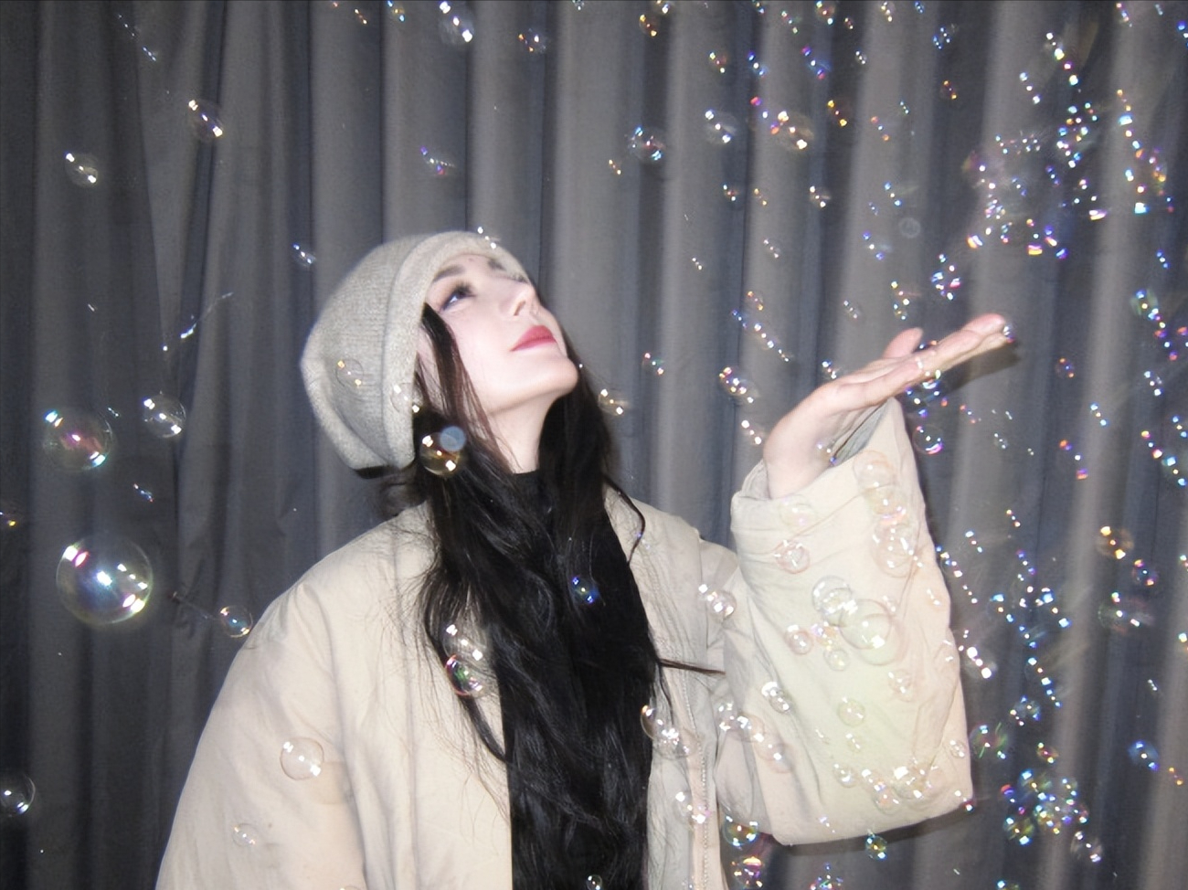 当天,迪丽热巴一改往日的冷艳形象,呈现出了另一种不同的可爱风格。照片中的她,静静地站立在泡泡的世界里,目光柔和,似乎在与空气中的泡泡互动,充满了童趣与梦幻感。这一刻,迪丽热巴仿佛回到了无忧无虑的童年,仿佛每一个泡泡都代表着她的心情,每一个轻轻飘起的泡泡都带着她的笑声。这种天真无邪的氛围,简直就是现实版的“泡泡女孩”。