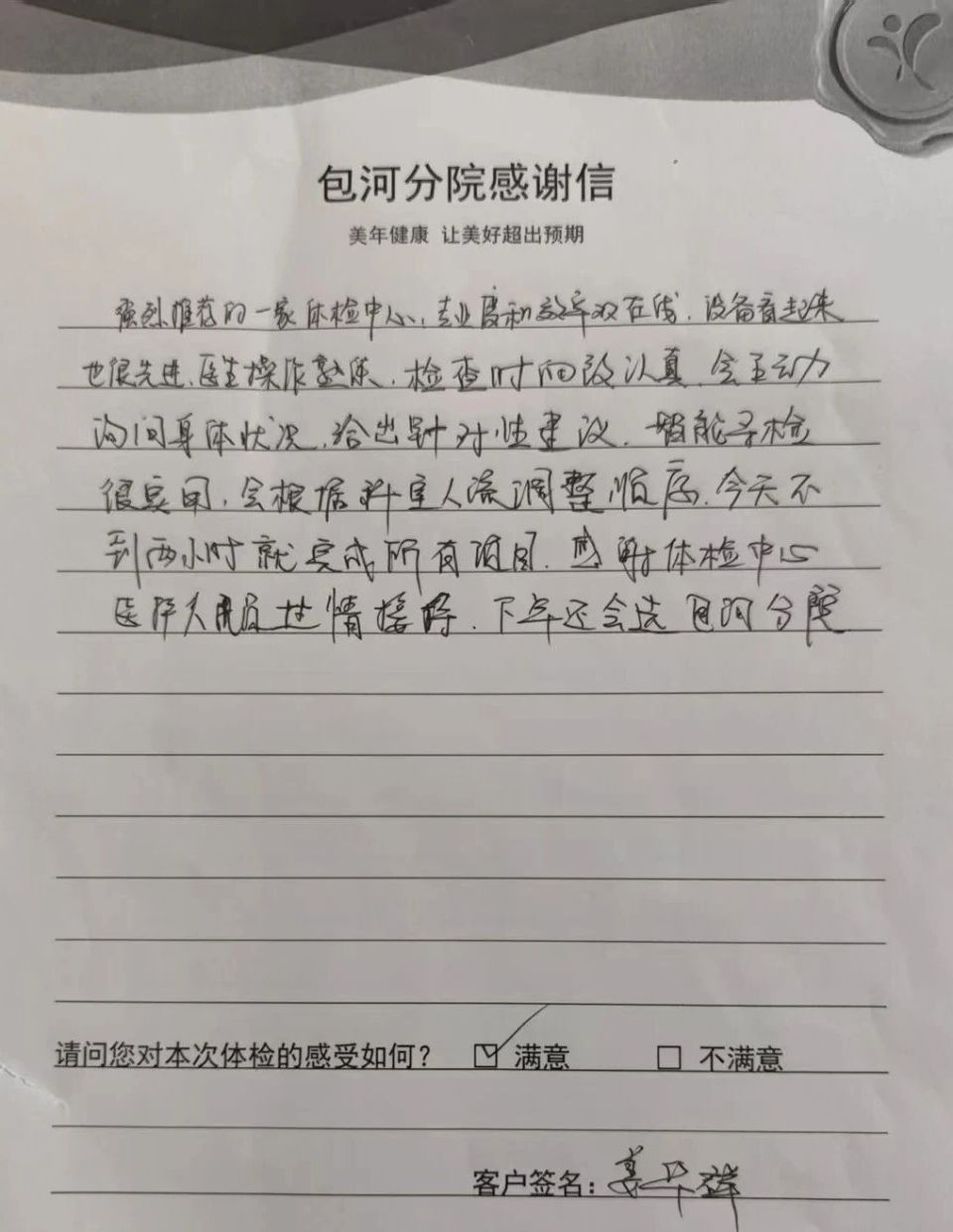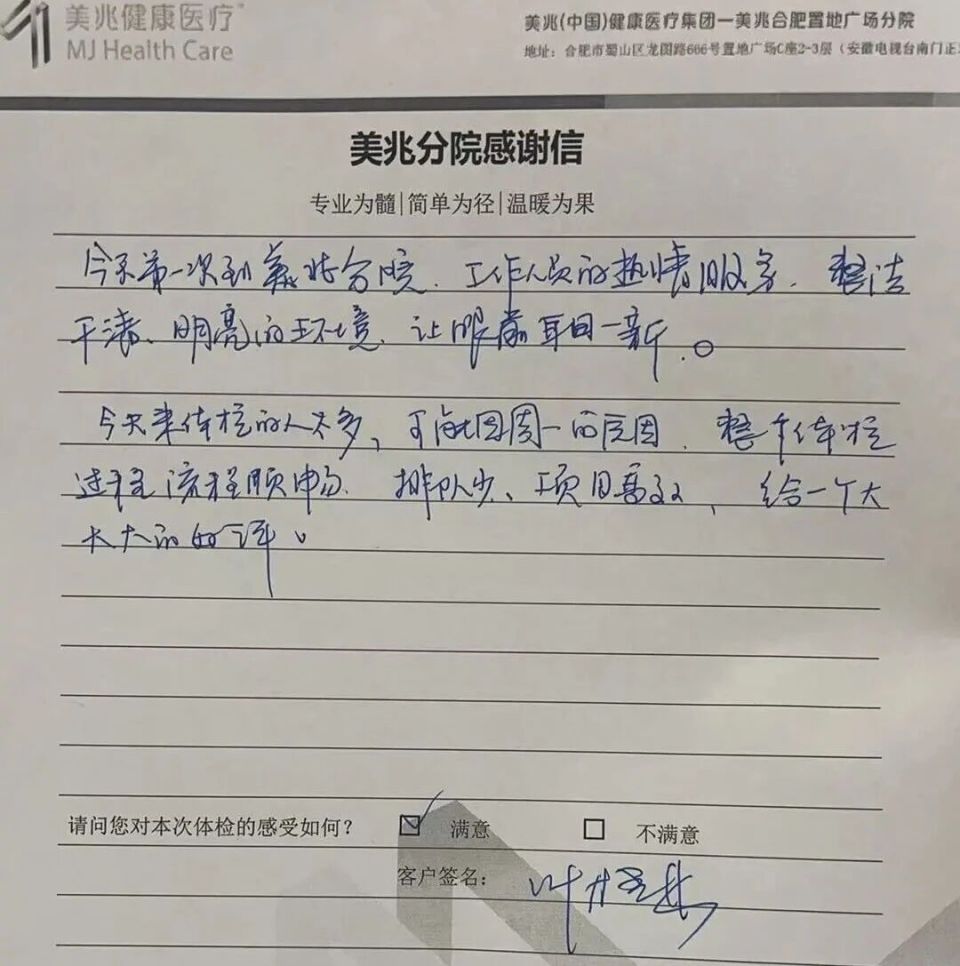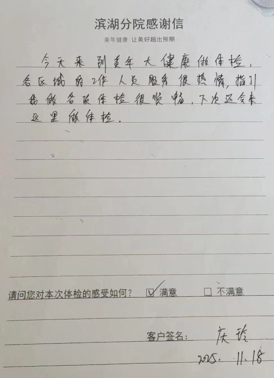 “我于 2025 年 11 月 17 日在美年大健康庐阳分院体检,带着父母一起,全程体验非常满意,因为带着小朋友,导检小姐姐还帮我带她玩,让我们在体检过程中轻松不少,医生也很专业,态度特别温柔,检查也很仔细,做了这么多次体检,在这里是最温馨的,以后都准备在这里体检了,特别感谢!”—— 郭女士的感谢信,满是对庐阳分院的认可与信赖。