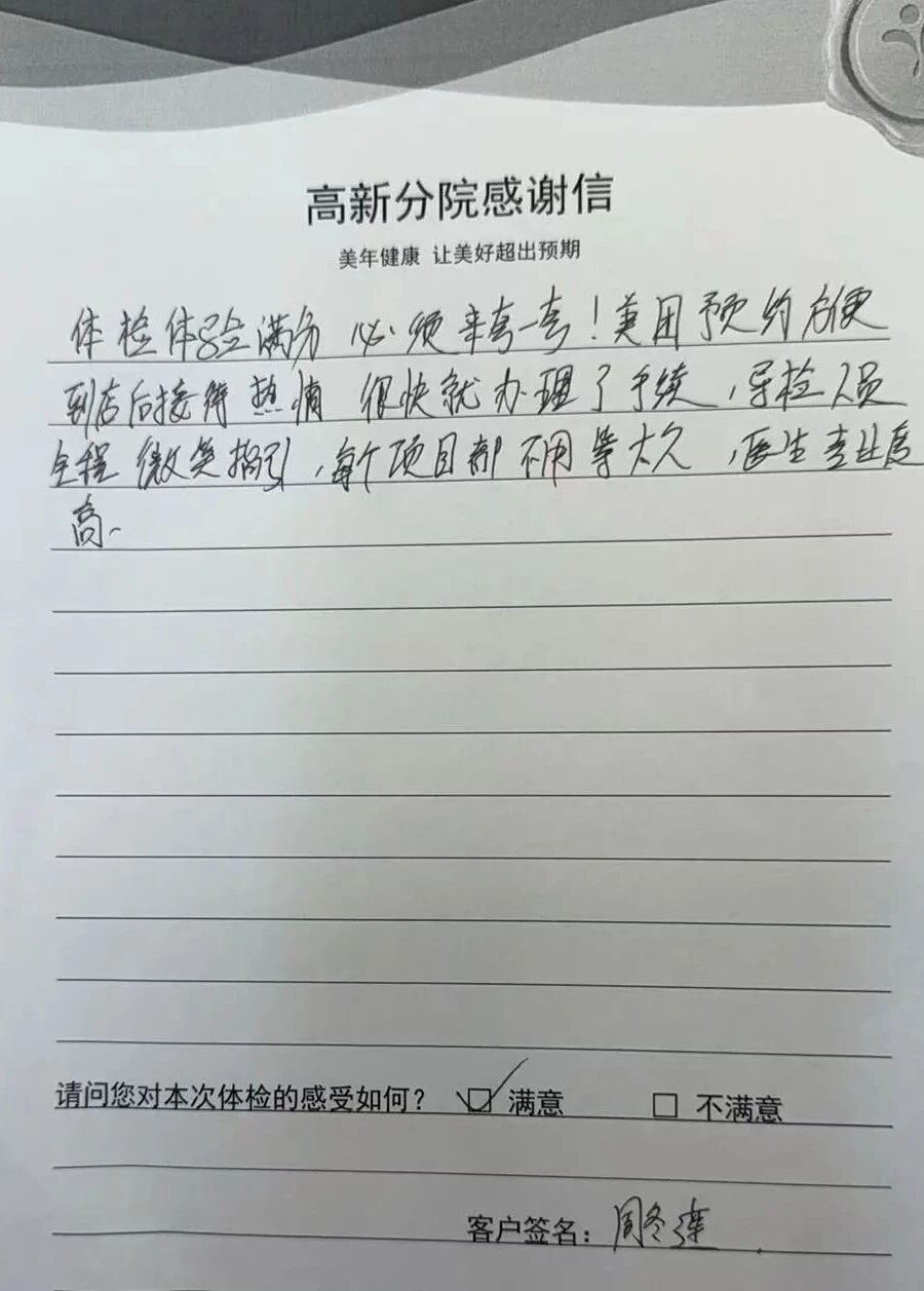 “体检体验满分,必须来夸一夸!美团预约方便,到店后接待热情,很快就办理好了手续,导检人员全程微笑指引,每个项目都不用等太久,医生专业度高!”—— 周女士的 “满分好评”,是对高新分院的全方位认可。