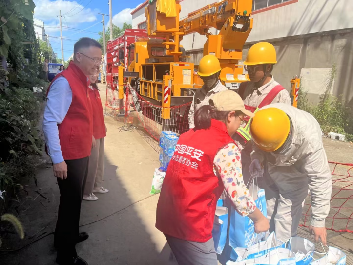 在吴中区临湖镇不停电作业现场,10余名工作人员正脚踩绝缘斗臂车,在近40℃的高空进行电路检修,工人们的工作服早已被汗水浸透又晒干,形成层层盐渍。志愿者们快步上前,将清凉物资递到工人手中:“师傅们高空作业太辛苦了!快喝瓶冰水降降温,一定要注意安全!” 豆大的汗珠从黝黑的脸颊滑落,工人师傅接过物资时的那句“谢谢你们记得我们”,让现场所有人深受触动。平安融易志愿者为电力工人送上清凉物资