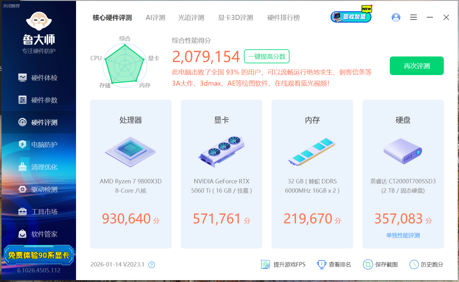 我们使用鲁大师跑了一个分,其中,内存的得分为219670分,整机的性能得分为2079154分。