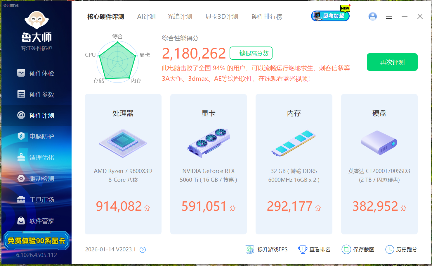 我们依旧使用鲁大师进行跑分,其中内存的得分为292177分,在它的助力下整机的性能得分为2180262分,还是蛮厉害了。其中内存将默频提升了约33%。
