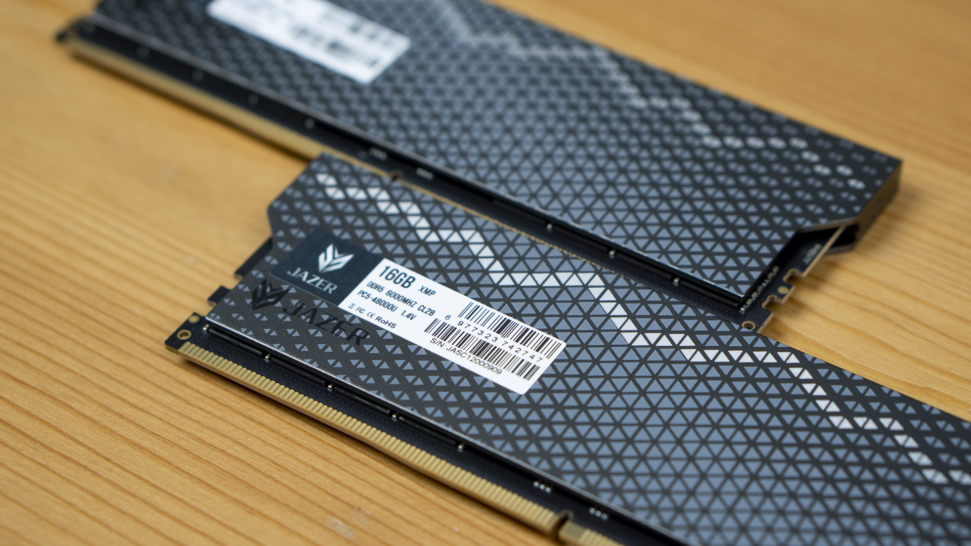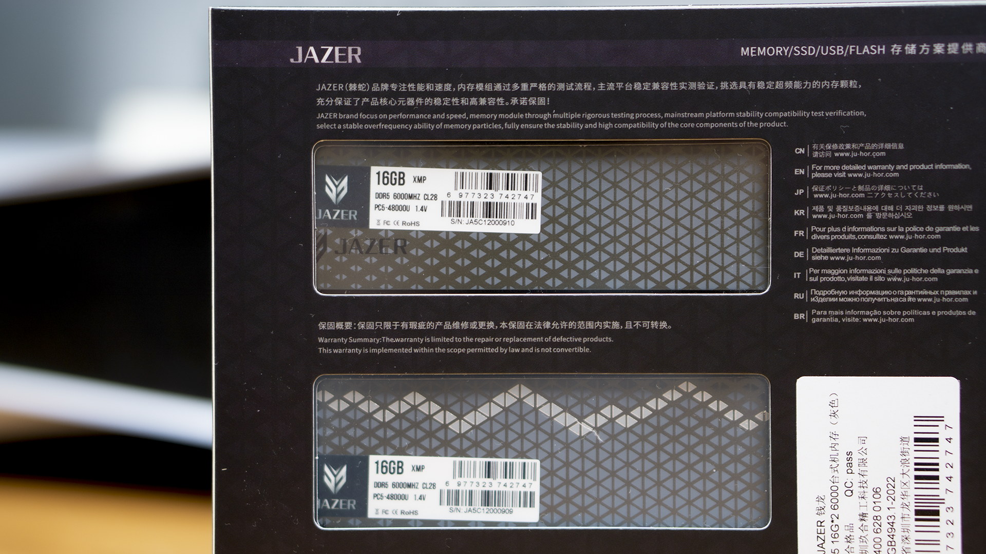 而在背面标签上,我们就可以发现,原来这对新品牌的内存是来自国内内存大厂玖合,我们也曾经测试过它家的多款内存,不论是做工、用料还是性能都是一线水平。