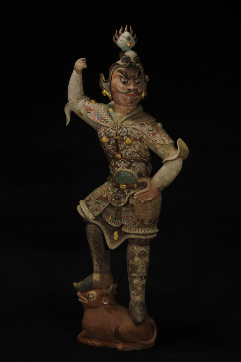 最震撼人心的,是两尊高达1.08米的彩绘天王俑。一尊踏羊,一尊踏牛,红陶质地,通体彩绘,局部还残留着贴金箔的痕迹。它们怒目圆睁、神态狰狞,身披铠甲,足蹬长靴,一个右手叉腰,一个举臂挥拳,脚下的羊和牛被踏得服服帖帖。