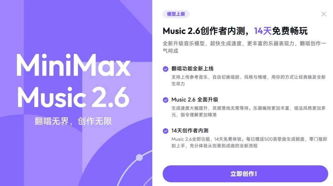 目前,Music 2.6 已开放体验,C 端用户可免费畅玩 14 天,每日有 500 首免费生成额度,API 也对所有用户开放 Music 2.6 和 Cover 的调用。