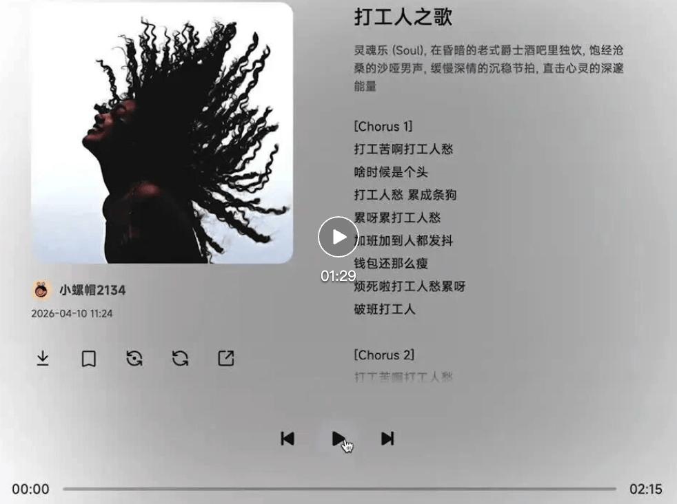 过去想做出一首像样的作品,要经历词、曲、编、录、混五道环节,周期起码半个月起,成本少则几千,多则数万。AI 出现后,输入一句提示词就能直出完整作品,创作成本一压再压。