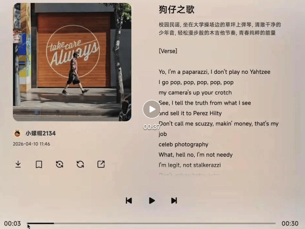 在一次节目上,安妮・海瑟薇即兴说唱 diss 狗仔。我们就让 MiniMax 把这首节奏密度很高的说唱改成校园民谣风格。