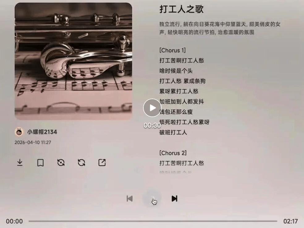 Music 2.6 对非专业创作者最友好的一点,是沟通成本大幅降低,即便不输入歌词,只给出风格提示词,最快 20s 内即可生成一首包含歌词的完整曲目。